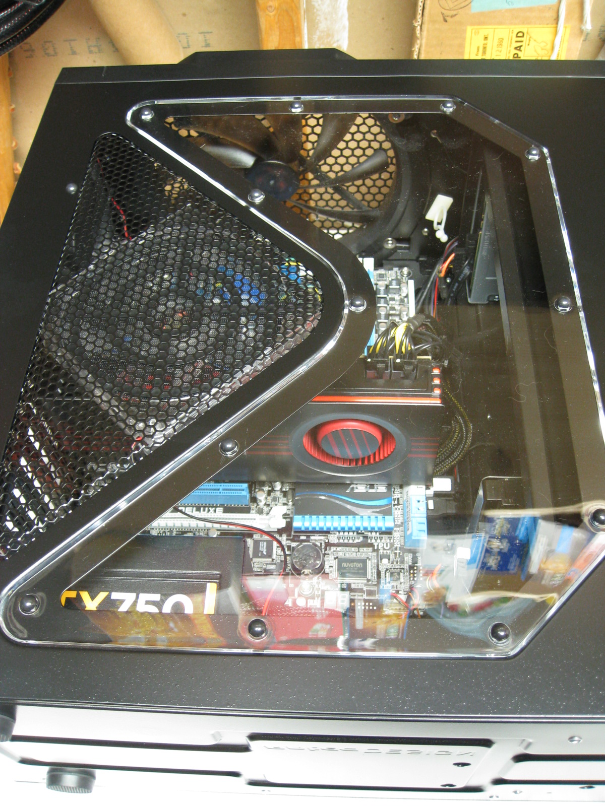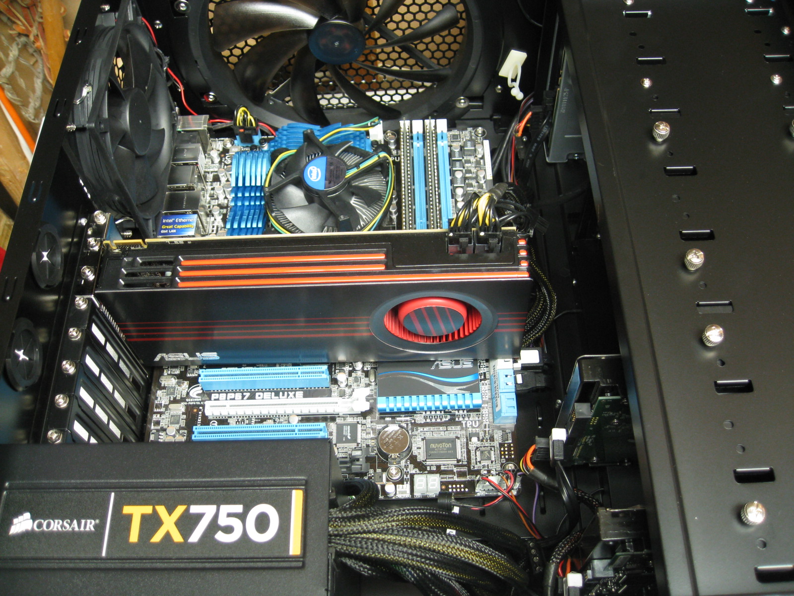 I upgraded a number of things since I took the pictures from its initial build. It used to have an Intel i7 2600k, ASUS ATI 6870 HD, (4x) 4 GB Corsair Vengeance LP PC3-12800 and a Corsair TX750 V2.