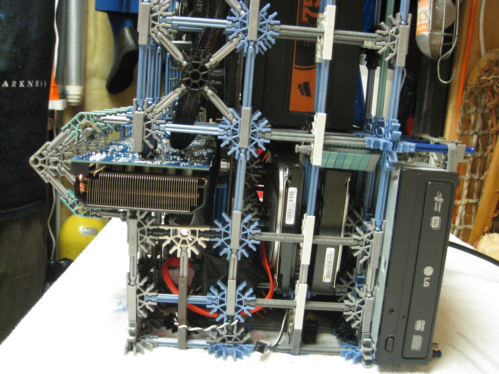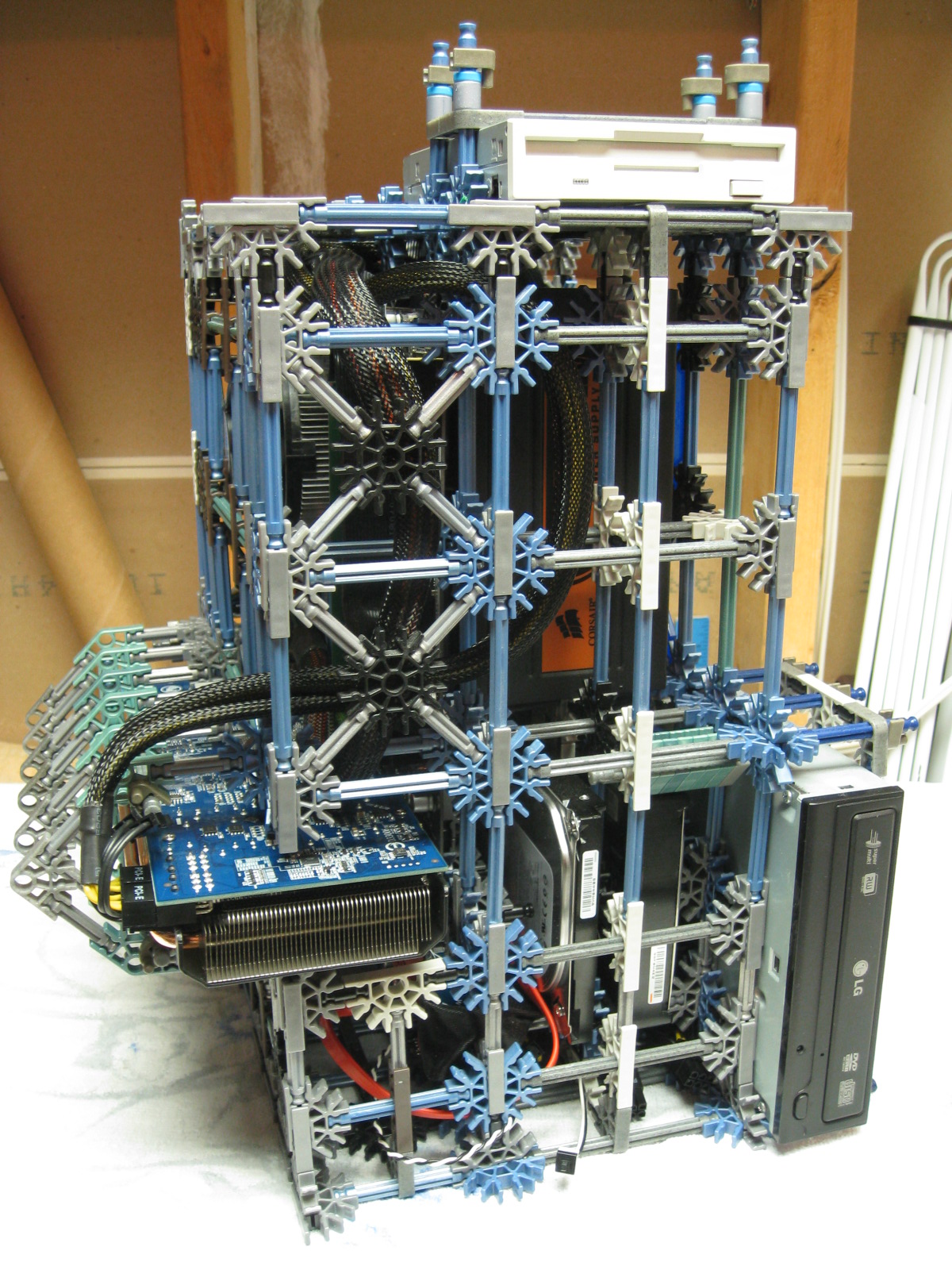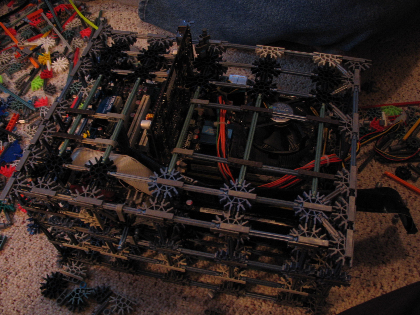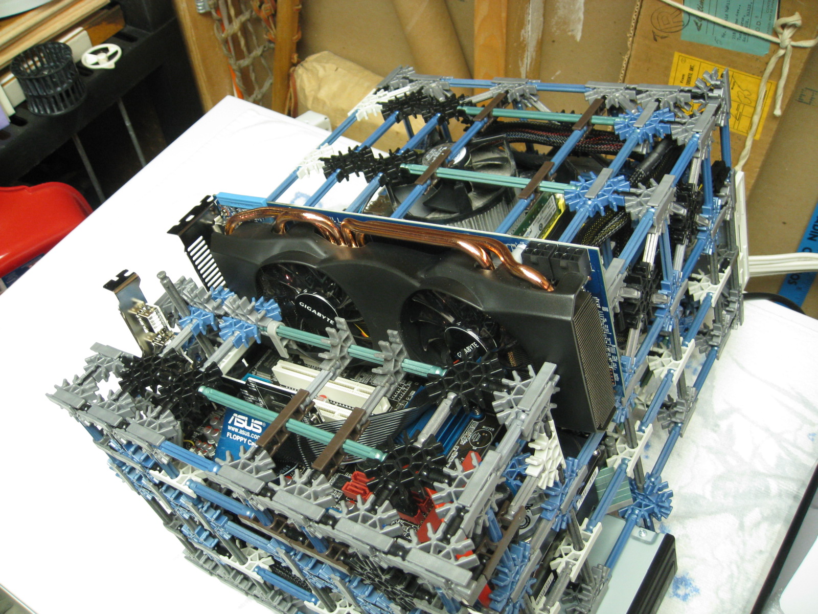 And now for some upgrades from a PC Power & Cooling 470W PSU and XFX 8600 GT to a Corsair TX750 PSU and Gigabyte 5870 HD! I don't have any pictures of us trying to cram the massive wad of cables from the 750TX into the K'nex, but I assure you it was no easy task!