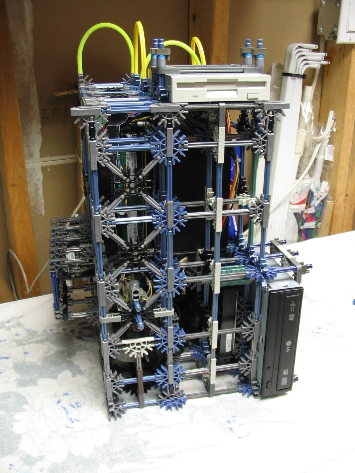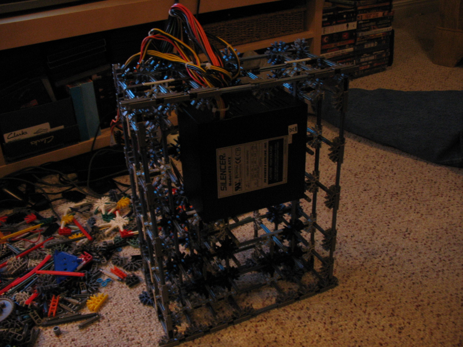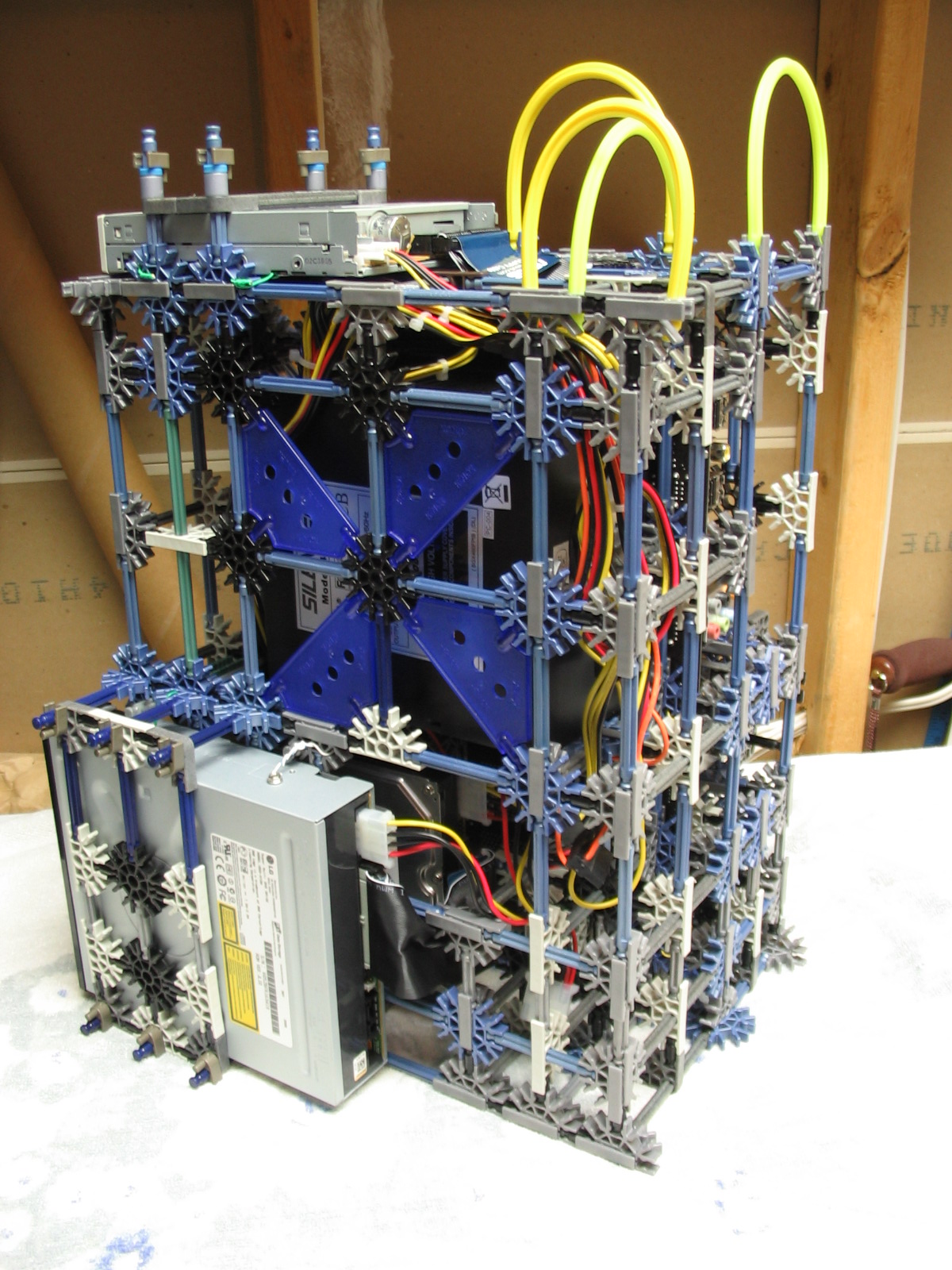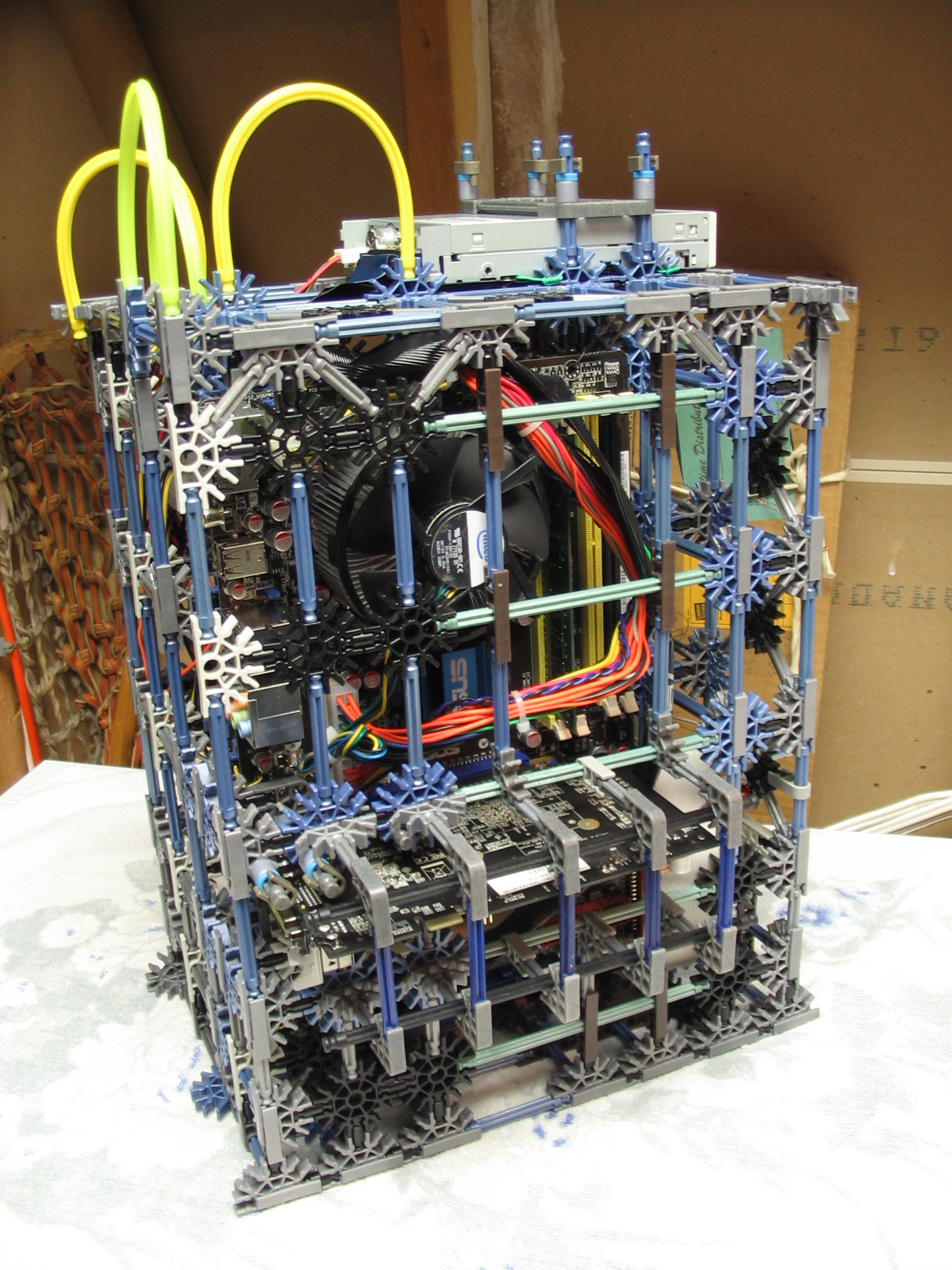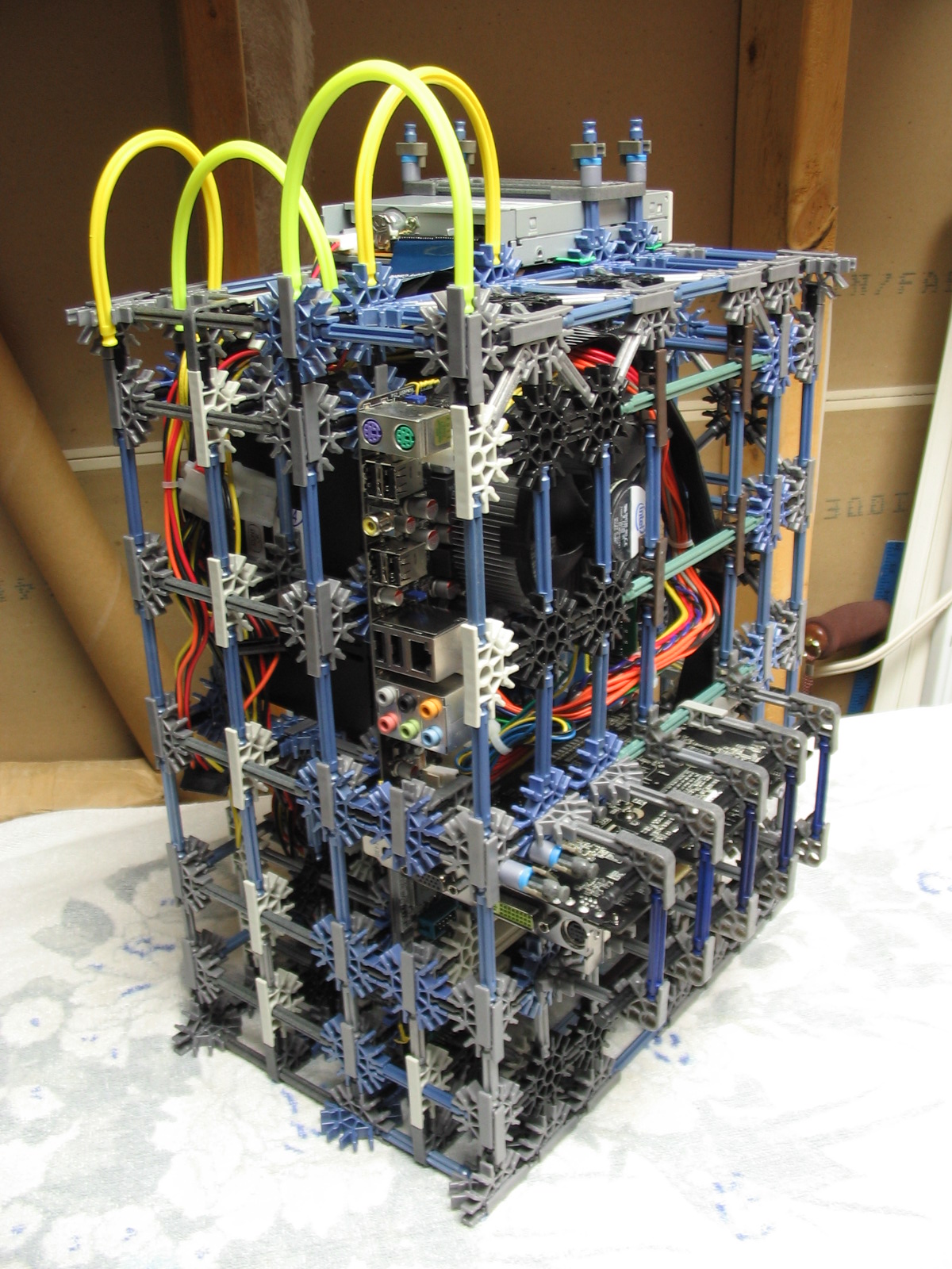 And now for some upgrades from a PC Power & Cooling 470W PSU and XFX 8600 GT to a Corsair TX750 PSU and Gigabyte 5870 HD! I don't have any pictures of us trying to cram the massive wad of cables from the 750TX into the K'nex, but I assure you it was no easy task!