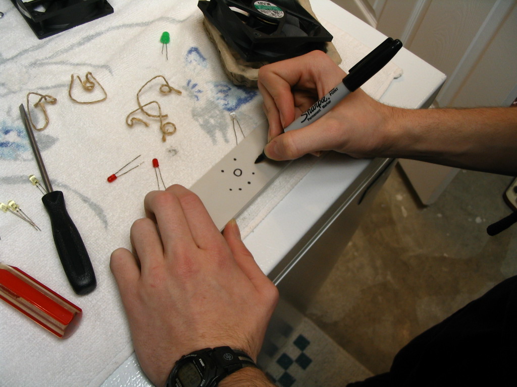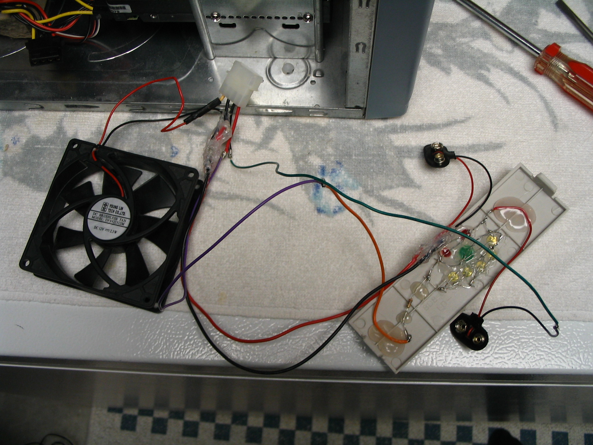 The finished product. Powered by a single molex connector, the 12V goes to the fan and the 5V goes to the LEDs, filtered with a resistor. The 9V clips are to allow the front plate to be detachable and swappable.
