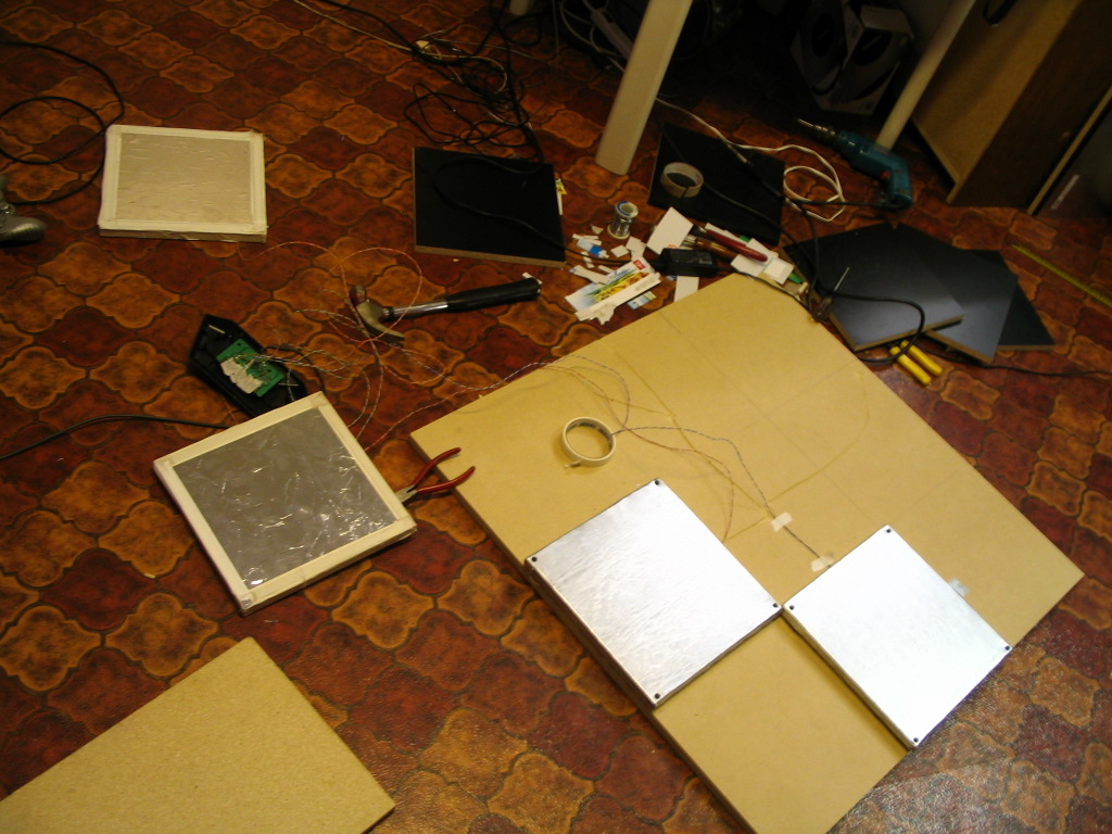 Took us about a full afternoon to build from start to finish, and we had a blast doing so. The buttons are made using tinfoil, sheet metal and a chunk of wood. The tinfoil is glued onto the board, with the corners elevated using strips of cardboard / masking tape. When pressure is applied to the sheet metal, which is placed on top of the board they make contact and create a connection. One wire is attached to the tinfoil, and the other to the sheet metal. The wires then directly attach to the control board for the old DDR mat. Turned out fairly well too, except one button was a little sticky but it was workable.