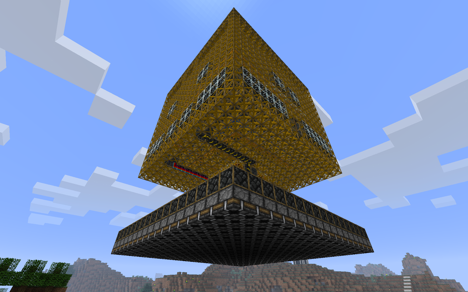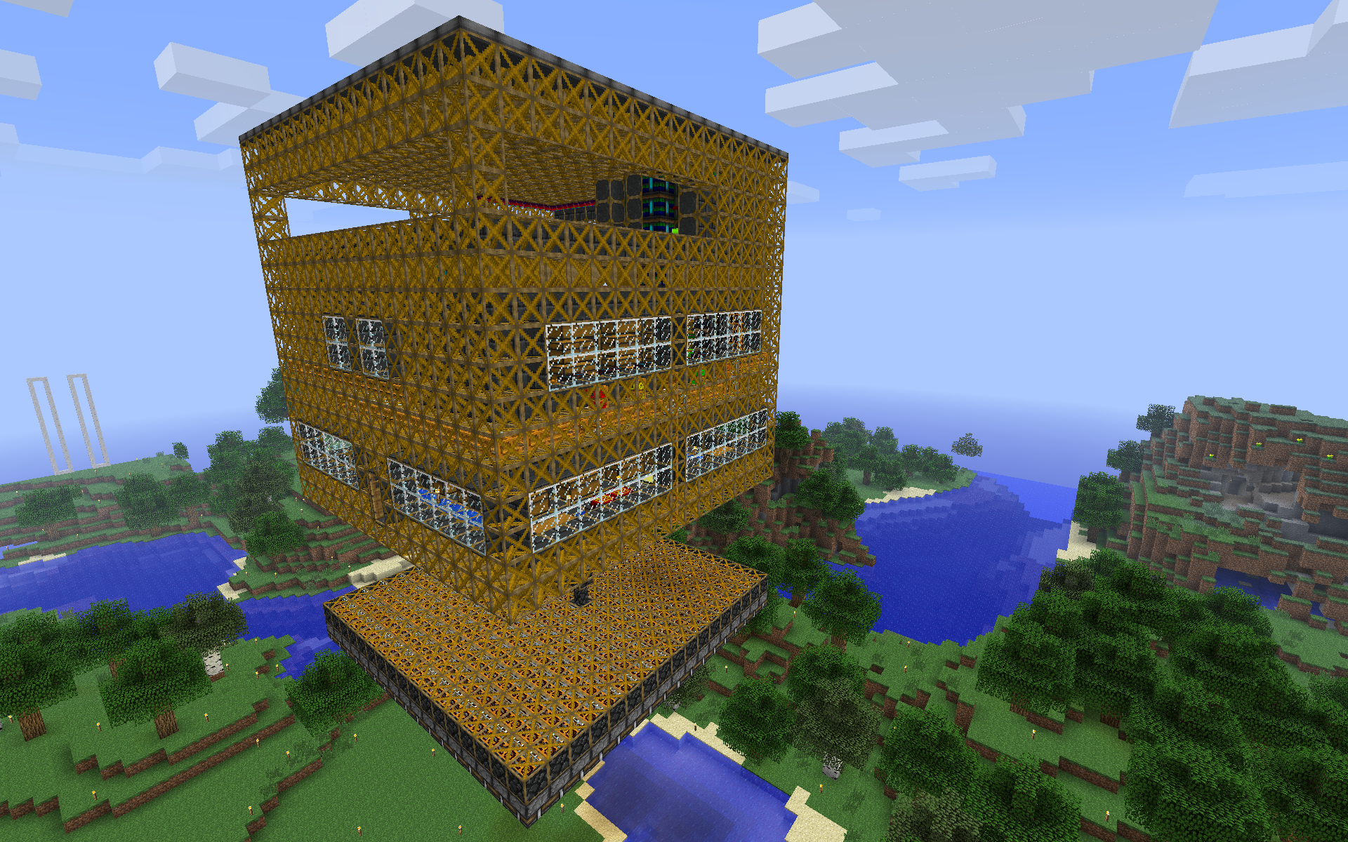 However, the mobile frame quarry is not finished and is still a work in progress (hence the ugly exterior view), but it is 99% functional! It features approximately 128 double chests for storage and 16 bluelectric furnaces for smelting. The frame quarry is controlled by a single ComputerCraft computer which runs a custom program to control the frame motors in its 6-directional (up / down / left / right / forward / backward) drive system. The computer also controls its independent, extendable mining drill platform, which moves up and down to collect resources, separate from the main frame itself. Frame pieces are placed / removed as it moves up and down to maintain connection in the RedPower2 pneumatic tubes so items can still flow through! There is a 17x17 grid of block breakers at the bottom of the drill platform to break and collect blocks at it descends. The computer can also be given commands remotely from another wirelessy connected ComputerCraft computer or turtle!
