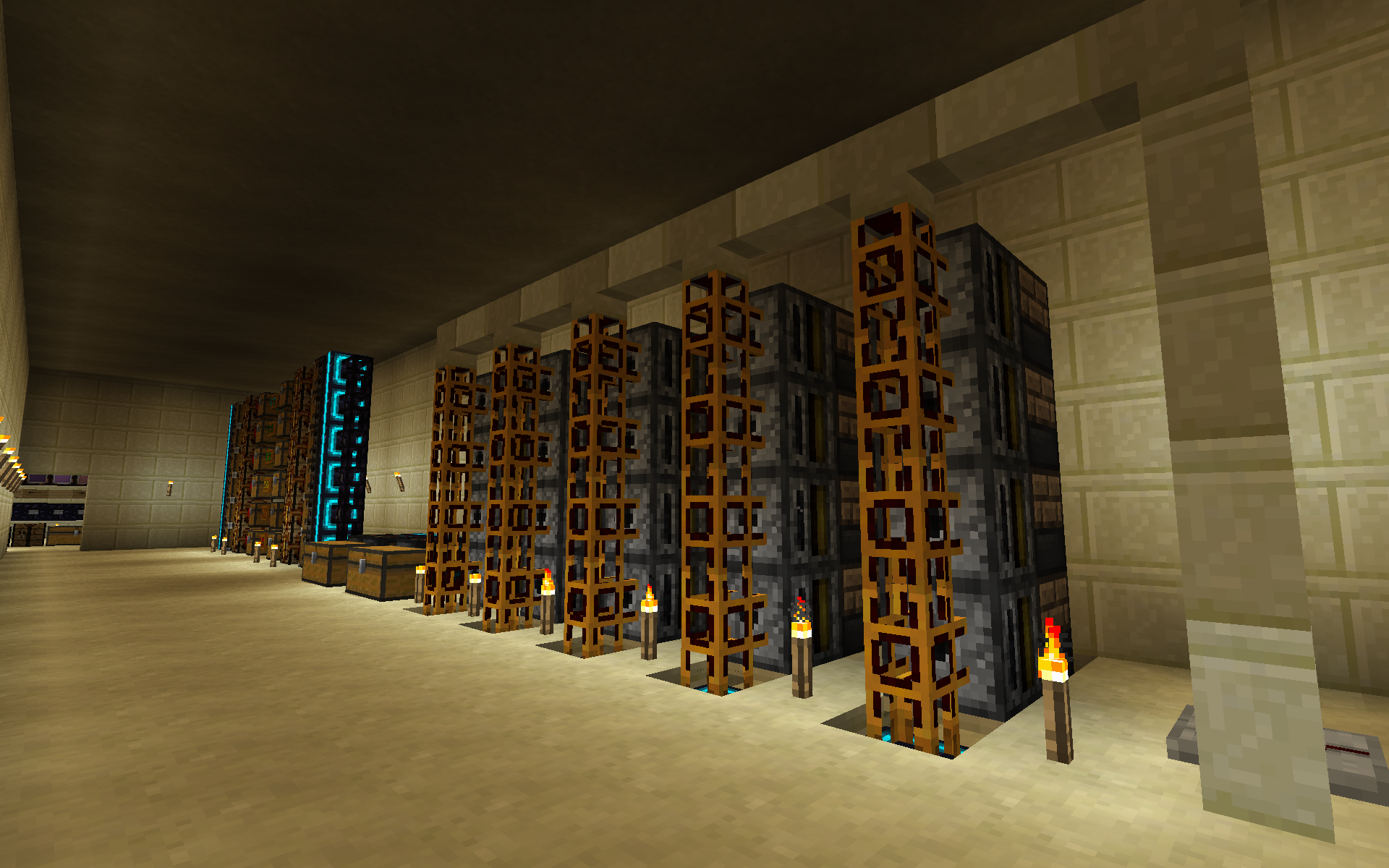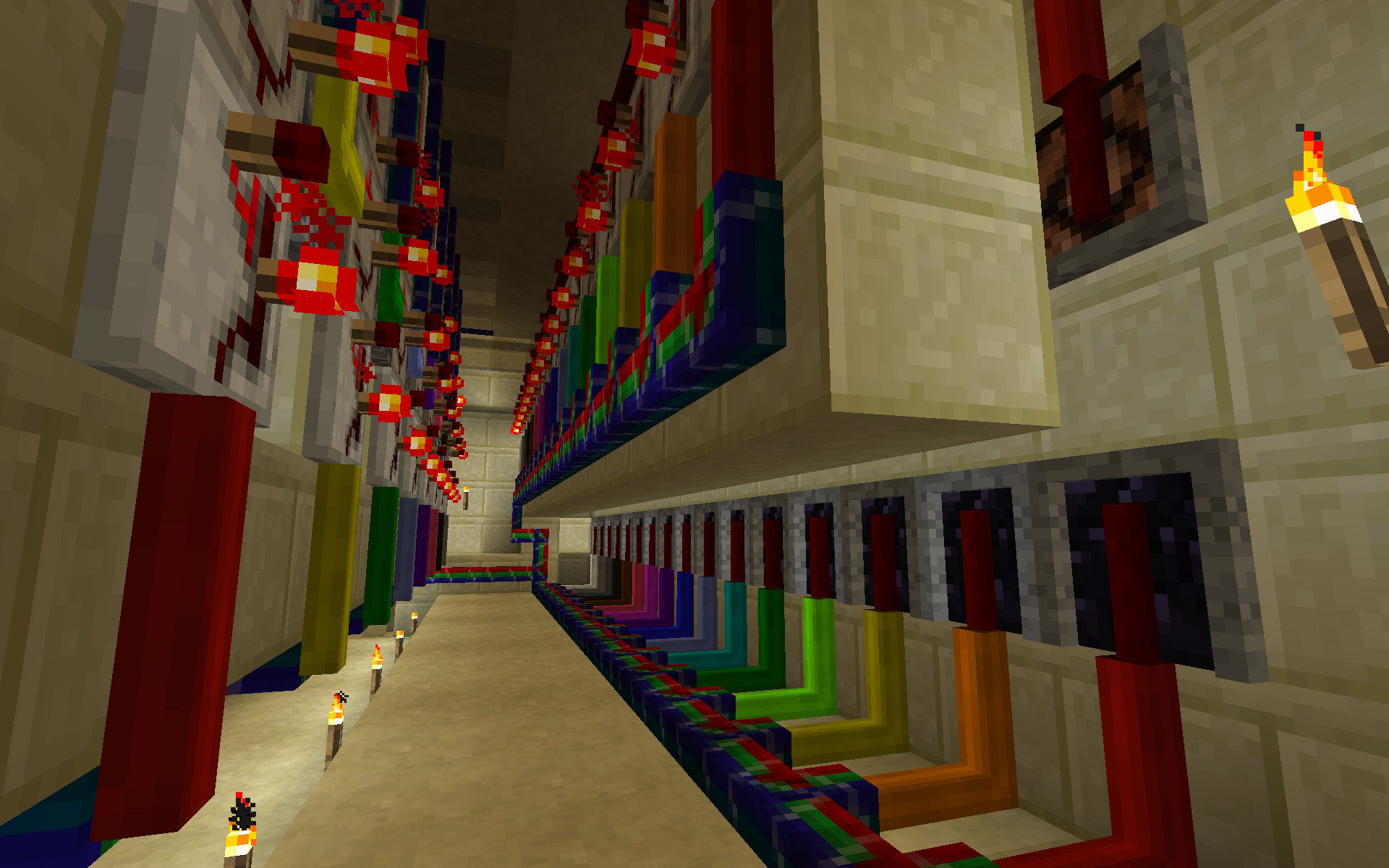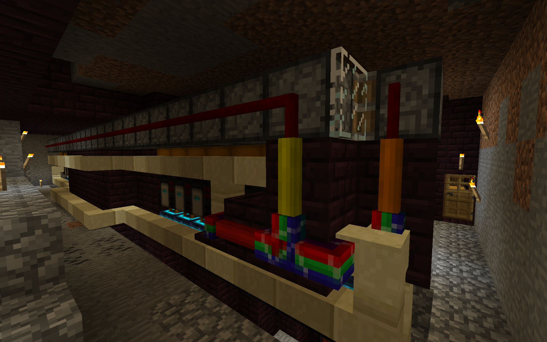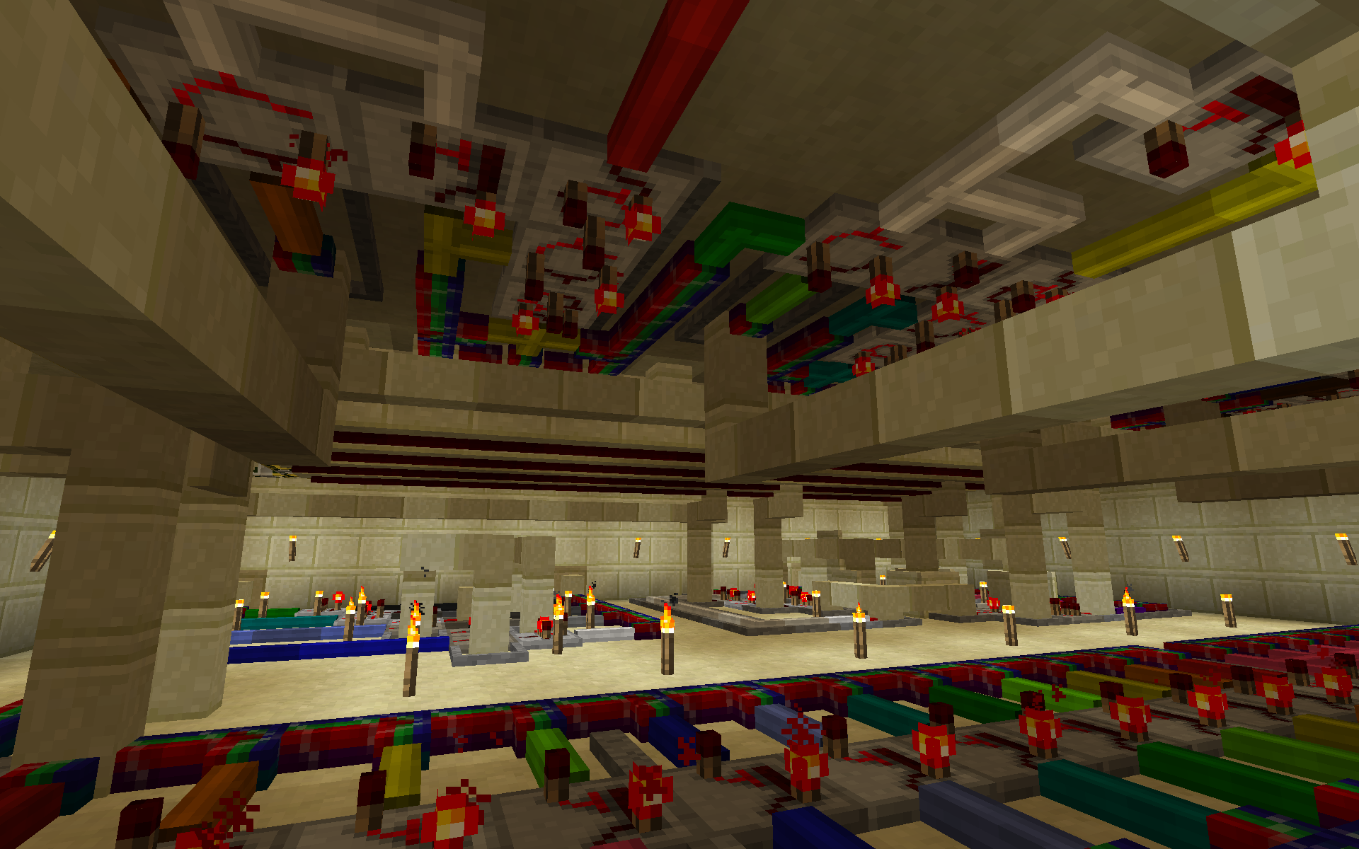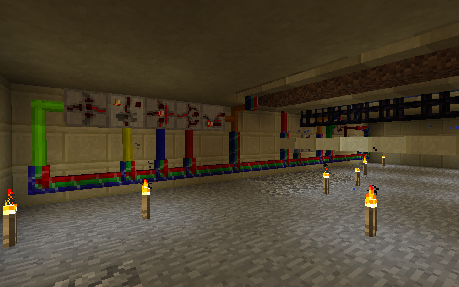 Quite a mouthfull, isn't it? It links components from RedPower2 and BuildCraft together, which can be a little awkward. There's a total of 8 identical modular refining systems where there are 4 placed on each side of the room. The system can be controlled using energy generated from BuildCraft combustion engines or RedPower2 bluelectric engines (although combustion is much faster and bluelectric usually drains the whole battery room). There are buttons on each side of the room to turn on / off individual refining systems, or to turn them all on / off at the same time. Combustion engines are hooked up to RedPower2 circuits that automatically monitor the engine to ensure that the coolant pumps are operating at optimal efficiency to avoid overheats, that there is oil to be processed and that the engine has not overheated. Oil is automatically pulled from the farthest row of tanks with oil in them and placed in the closest row of fuel tanks that still have room. All of the wiring is hidden on both the floor and cieling immediately below the main floor, with cables and wires twisted and tangled in every direction. It was quite a headache to keep track of which bundled cable I was dealing with as they all have the same coating (a mistake on my part), but I had a text file full of notes on how the system worked. Even then, I even had a hard time figuring it out while I was working on it!