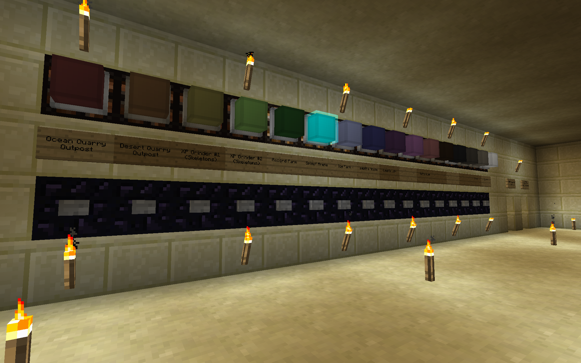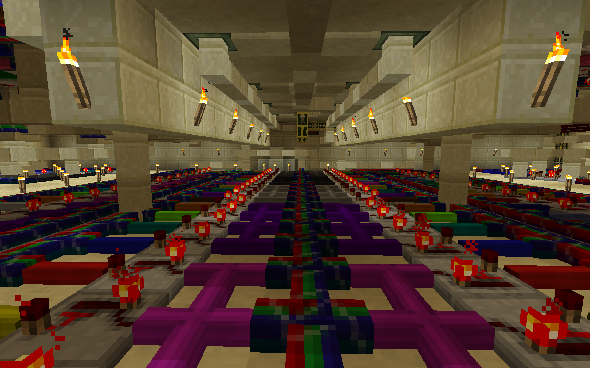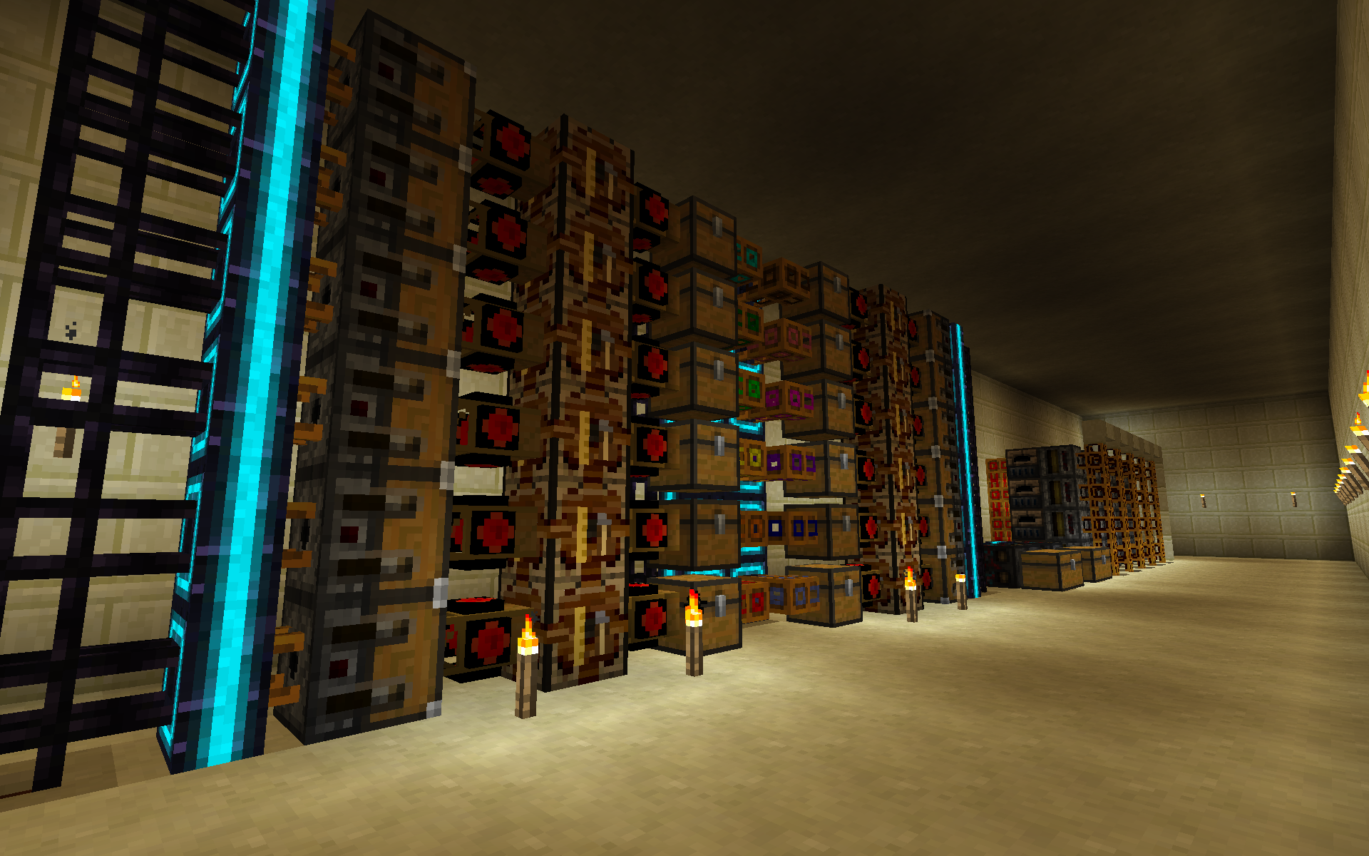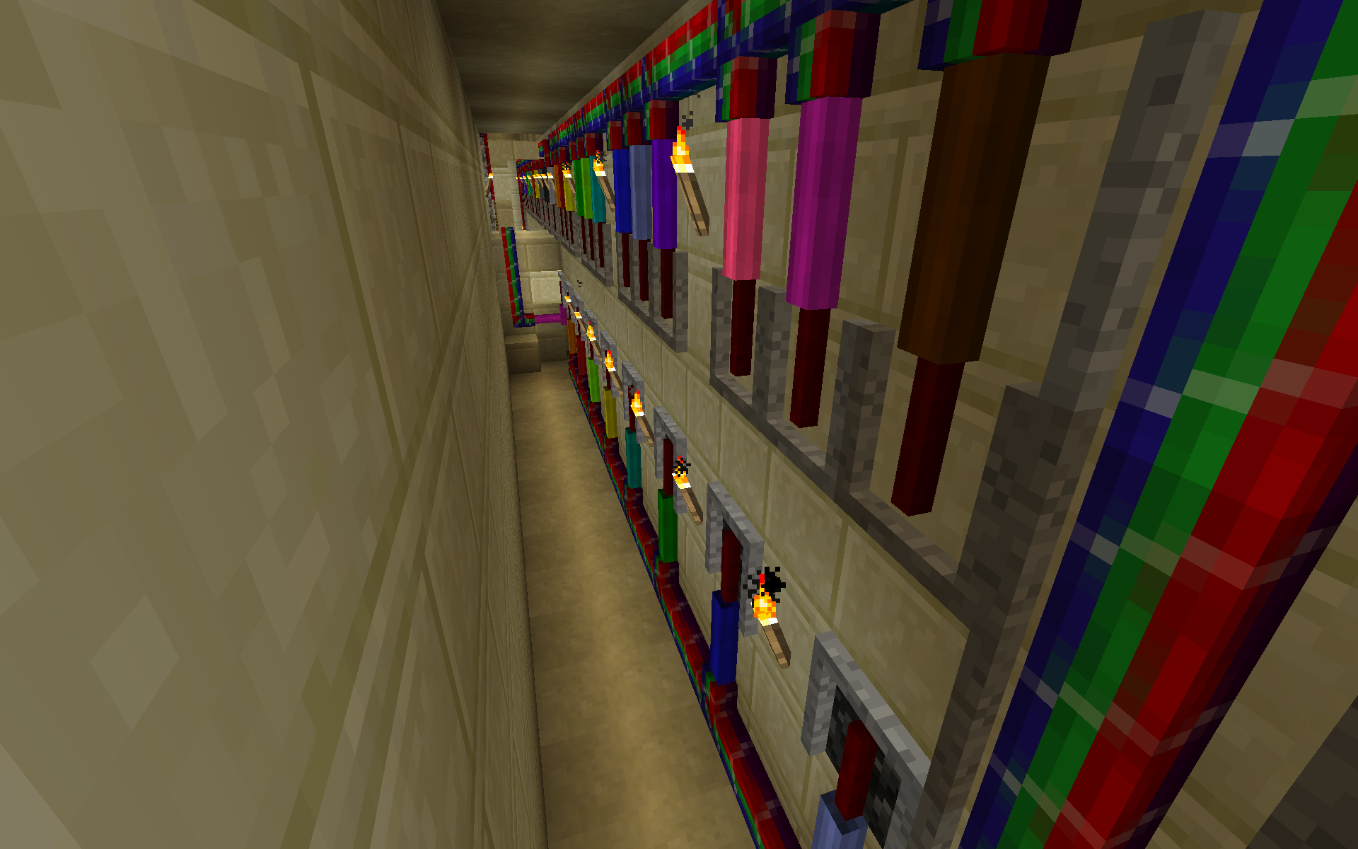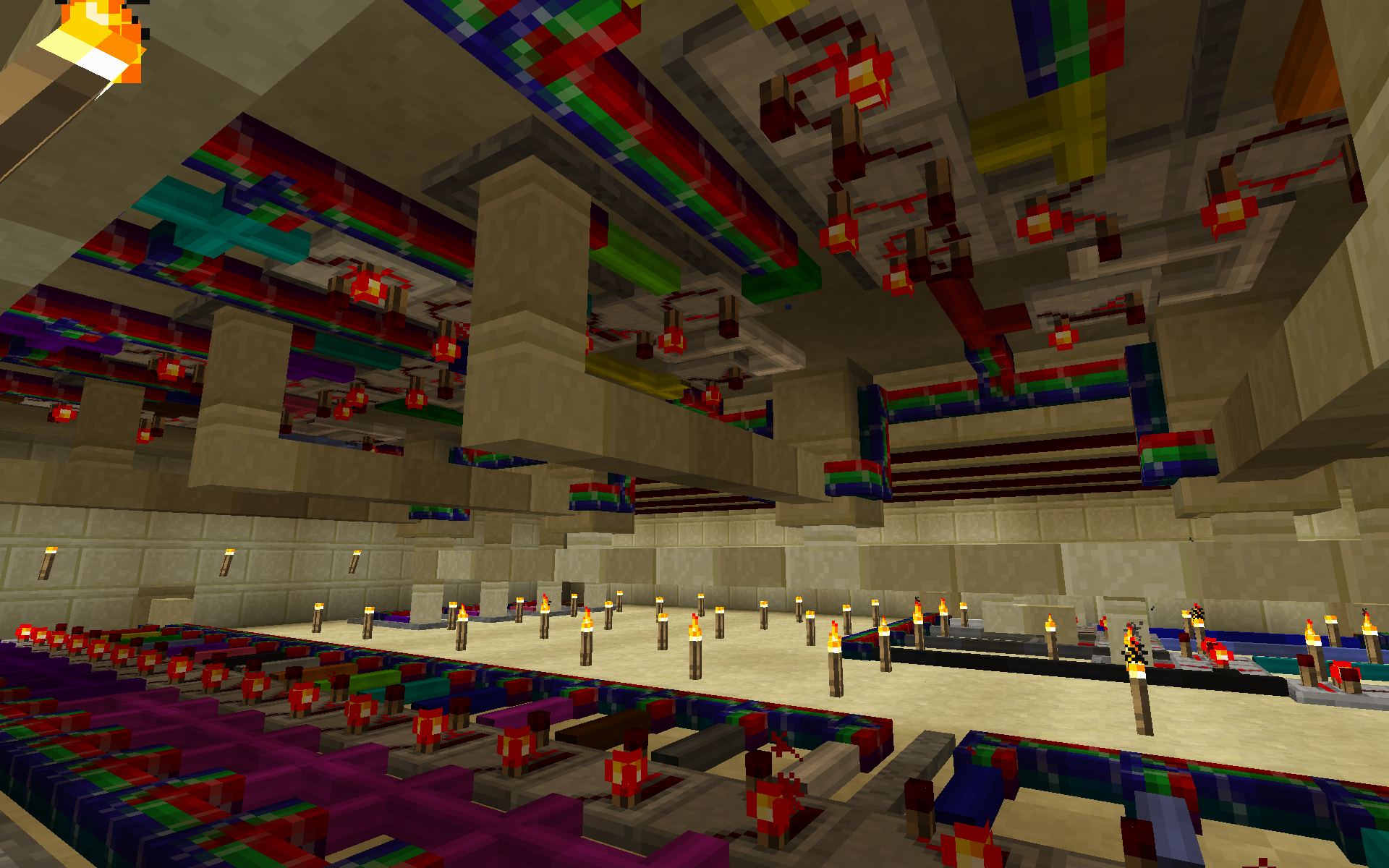 Quite a mouthfull, isn't it? It links components from RedPower2 and BuildCraft together, which can be a little awkward. There's a total of 8 identical modular refining systems where there are 4 placed on each side of the room. The system can be controlled using energy generated from BuildCraft combustion engines or RedPower2 bluelectric engines (although combustion is much faster and bluelectric usually drains the whole battery room). There are buttons on each side of the room to turn on / off individual refining systems, or to turn them all on / off at the same time. Combustion engines are hooked up to RedPower2 circuits that automatically monitor the engine to ensure that the coolant pumps are operating at optimal efficiency to avoid overheats, that there is oil to be processed and that the engine has not overheated. Oil is automatically pulled from the farthest row of tanks with oil in them and placed in the closest row of fuel tanks that still have room. All of the wiring is hidden on both the floor and cieling immediately below the main floor, with cables and wires twisted and tangled in every direction. It was quite a headache to keep track of which bundled cable I was dealing with as they all have the same coating (a mistake on my part), but I had a text file full of notes on how the system worked. Even then, I even had a hard time figuring it out while I was working on it!