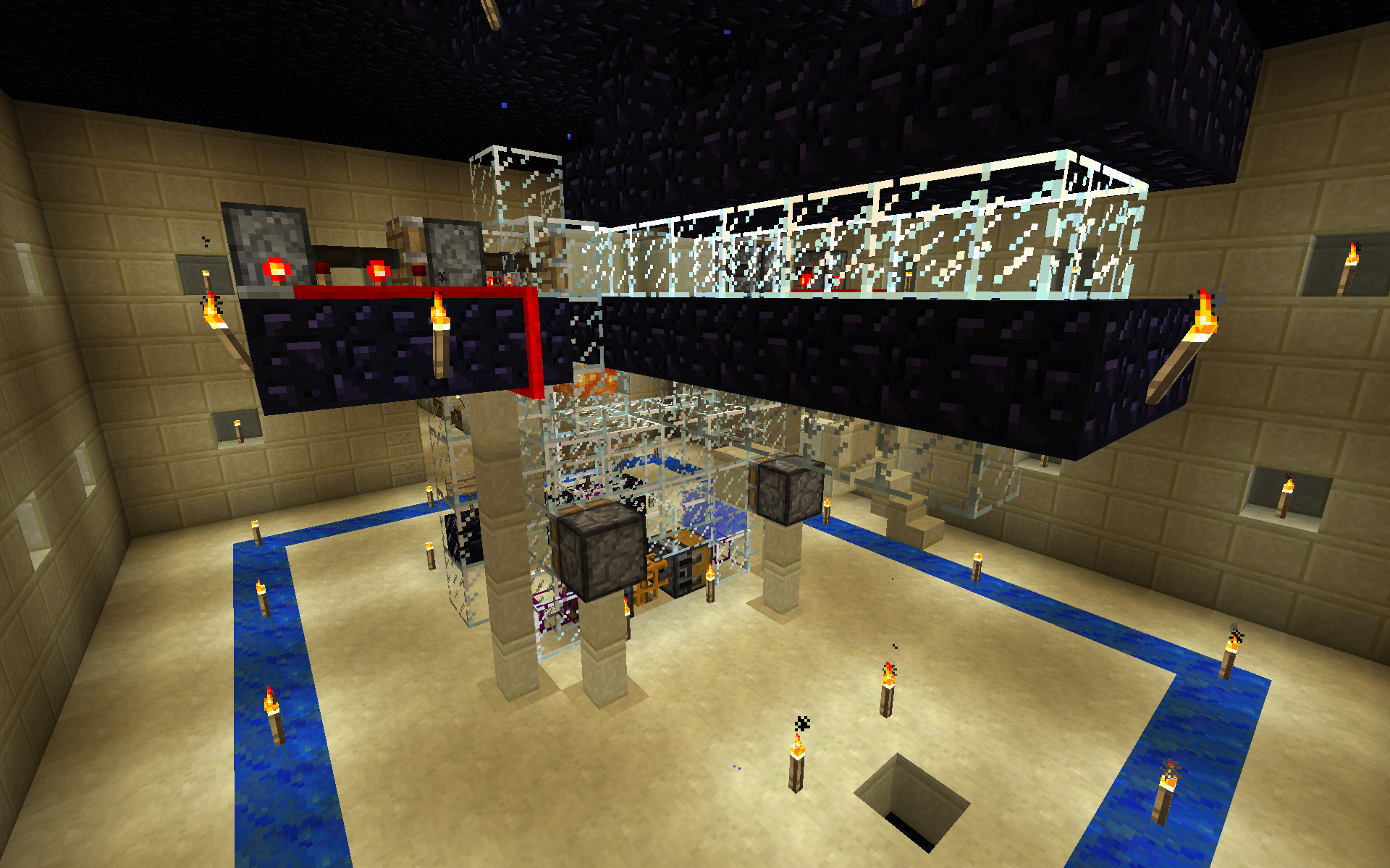 It utilizes a system to harvest snow from snow golems, then it is crafted into snow blocks, and stored in a buffer area of storage containers so there is always a surplus of snow blocks! When the snow supply starts to run out, more snow is generated automatically! The system is also self-powered using a separate thermal power system. Snow blocks are set in place using a system of RedPower2 circuits for timing, pistons and assemblers. The floor is actually square, but only the circular portion is visible to players!