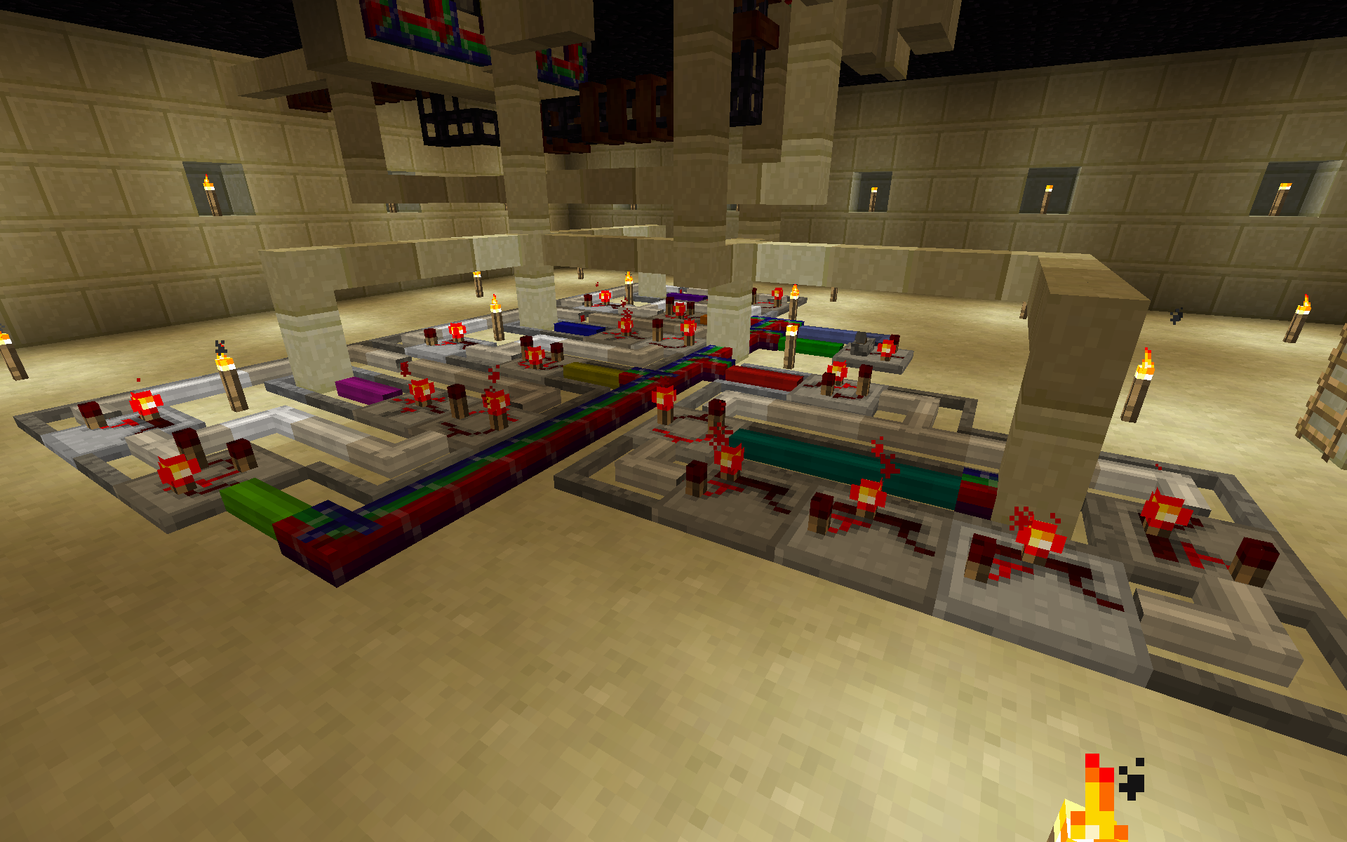 A glimpse at some of the wiring for our minecart destination selector. Uses a fairly simple system of RS Latches w/ delays to keep track of state & allow for easy resets.
