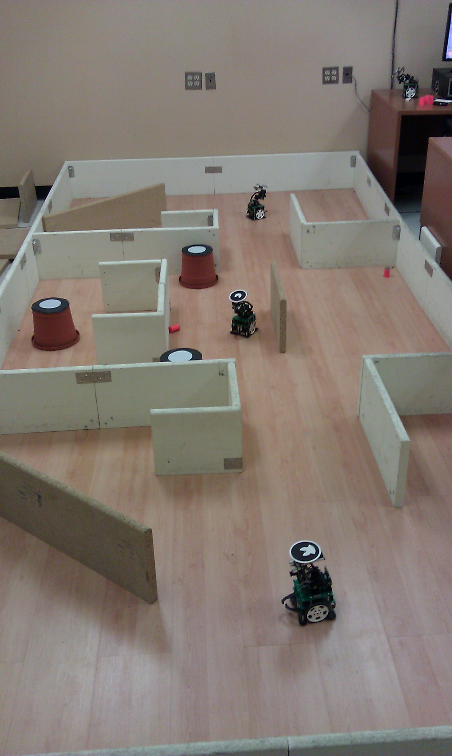 Top Secret Evil Plan was the nickname for our fourth year, winter 2011 robotics final project. The goal of the project was to simultaneously coordinate 3 robots operating in 3 different areas monitored by 3 different computers and get them to deliver 3 randomly placed blocks from each area to the holding area in the center, and the 3 pots from the left side of the center to the right side.