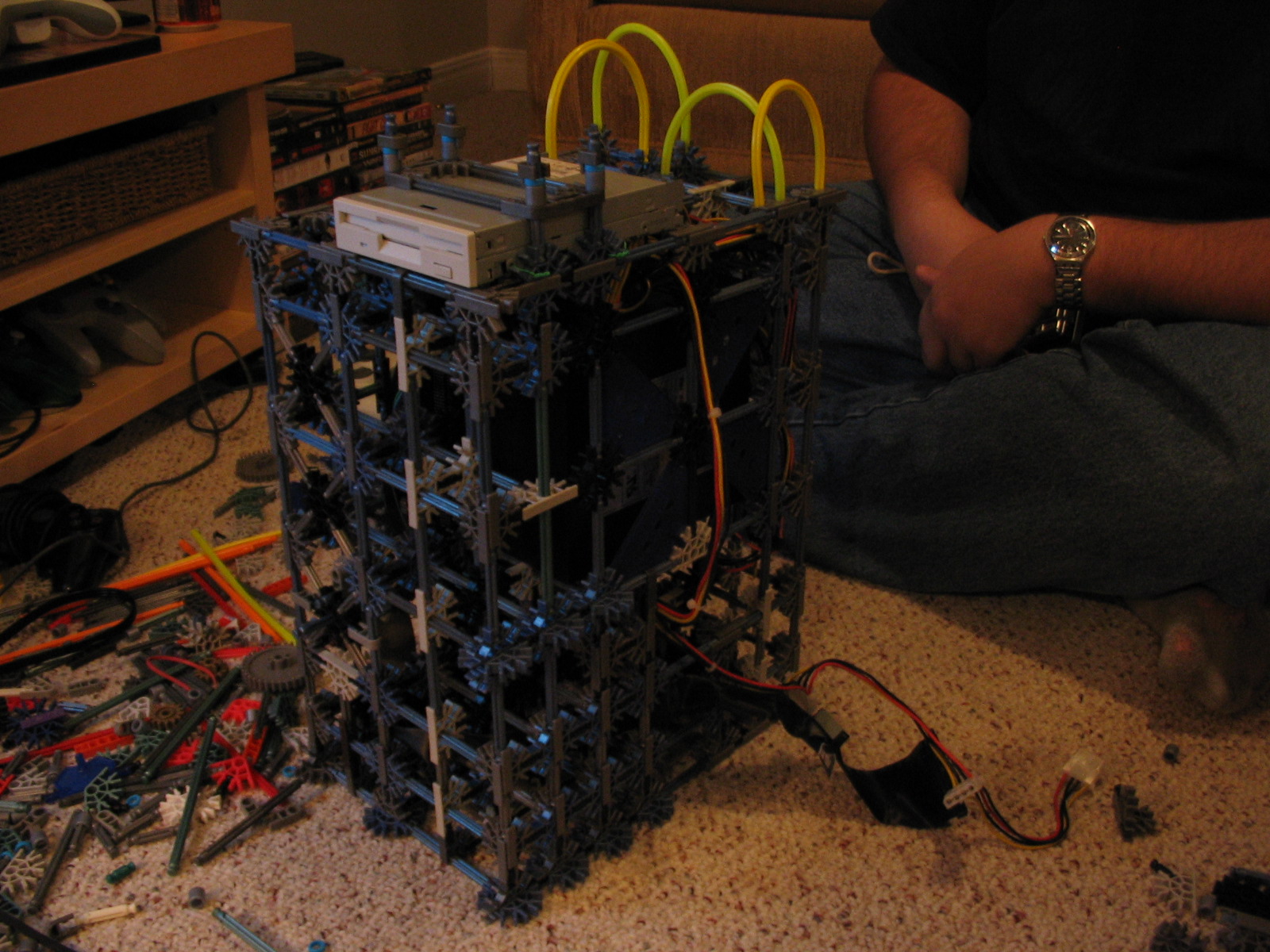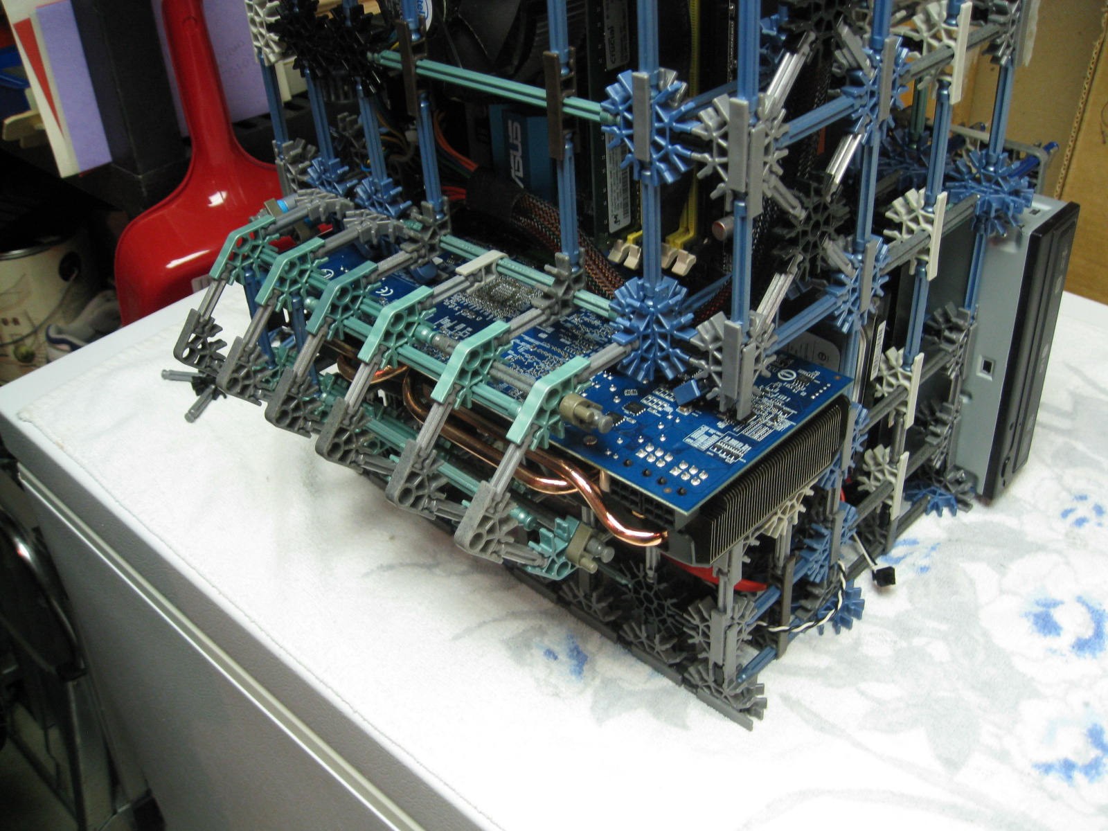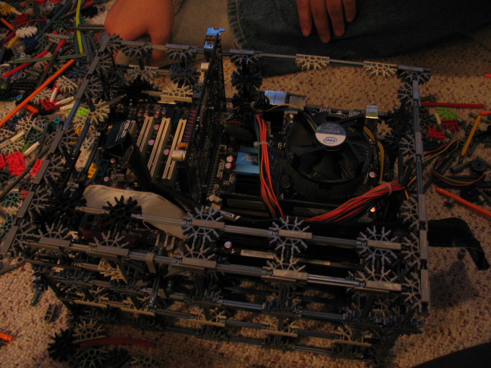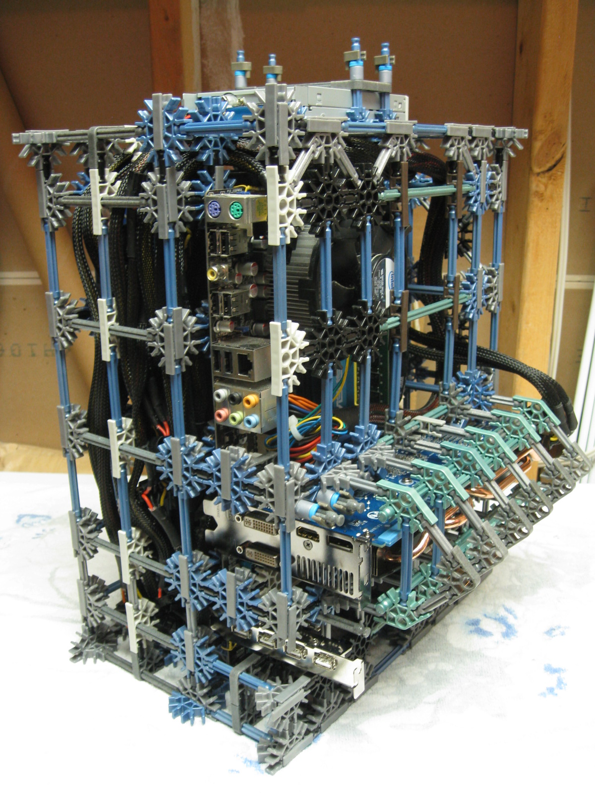 And now for some upgrades from a PC Power & Cooling 470W PSU and XFX 8600 GT to a Corsair TX750 PSU and Gigabyte 5870 HD! I don't have any pictures of us trying to cram the massive wad of cables from the 750TX into the K'nex, but I assure you it was no easy task!