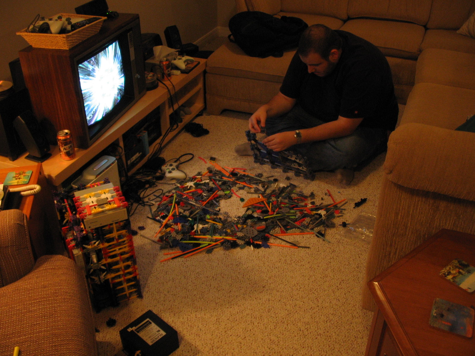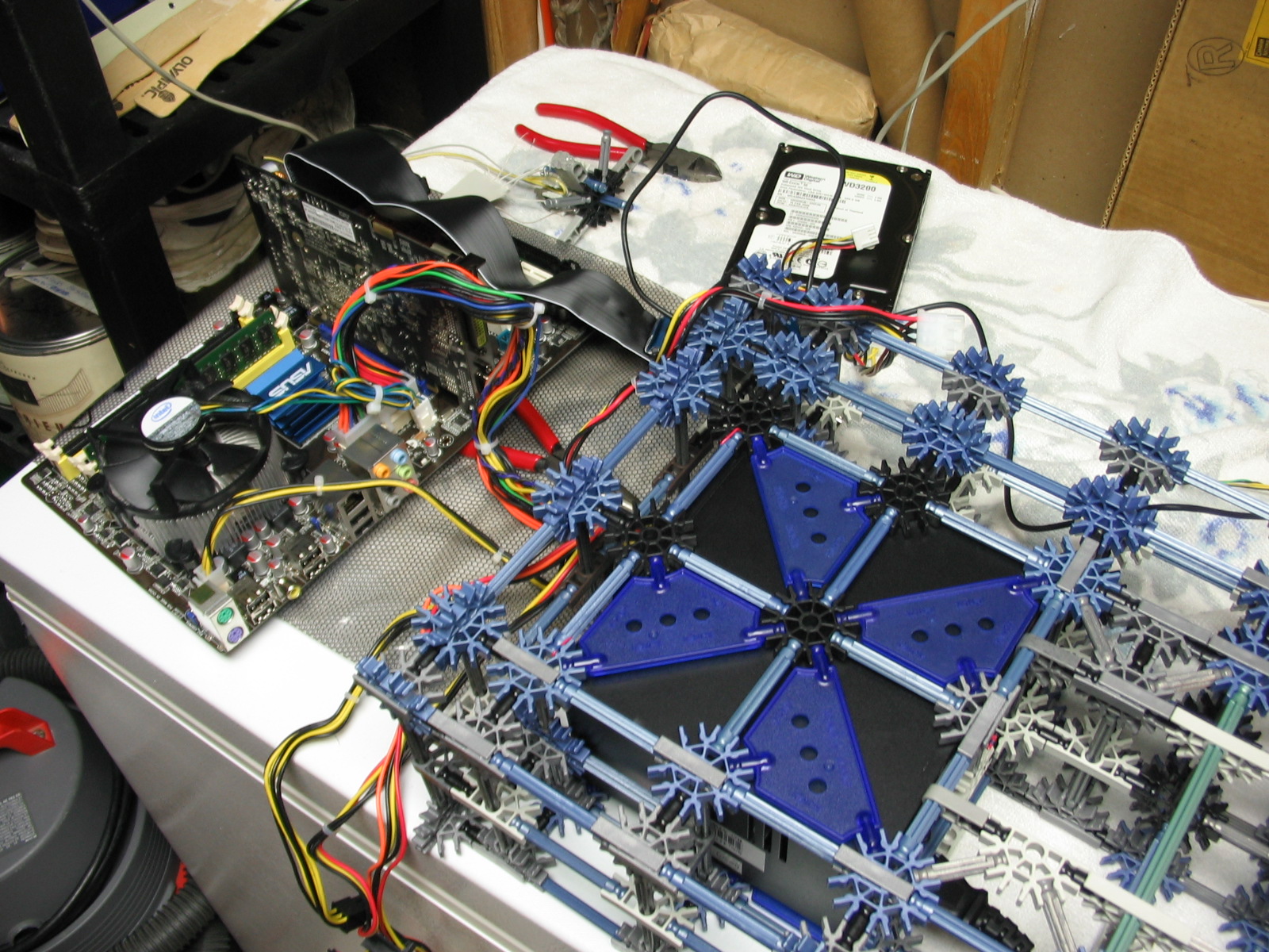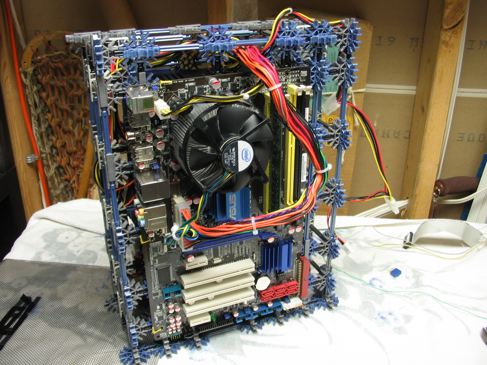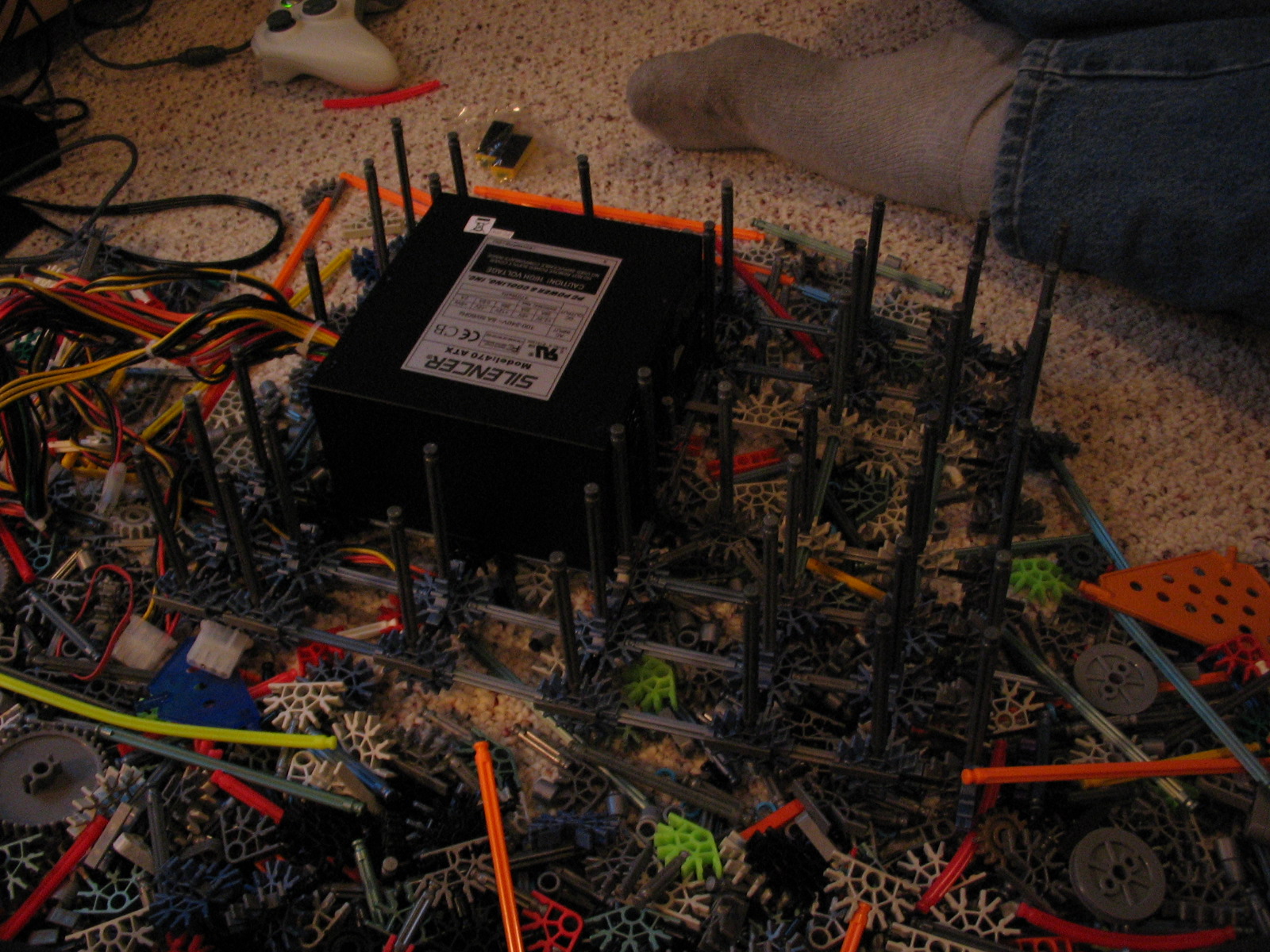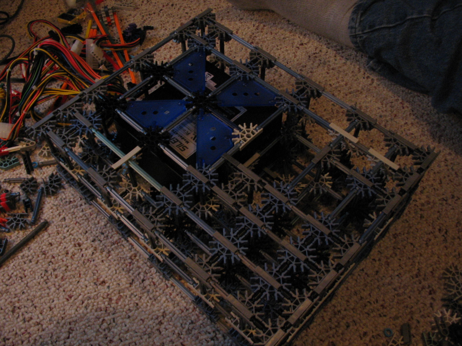 And now for some upgrades from a PC Power & Cooling 470W PSU and XFX 8600 GT to a Corsair TX750 PSU and Gigabyte 5870 HD! I don't have any pictures of us trying to cram the massive wad of cables from the 750TX into the K'nex, but I assure you it was no easy task!