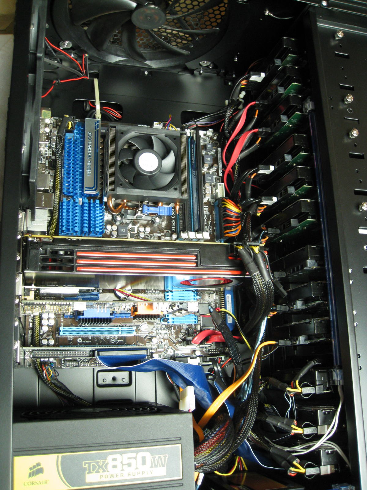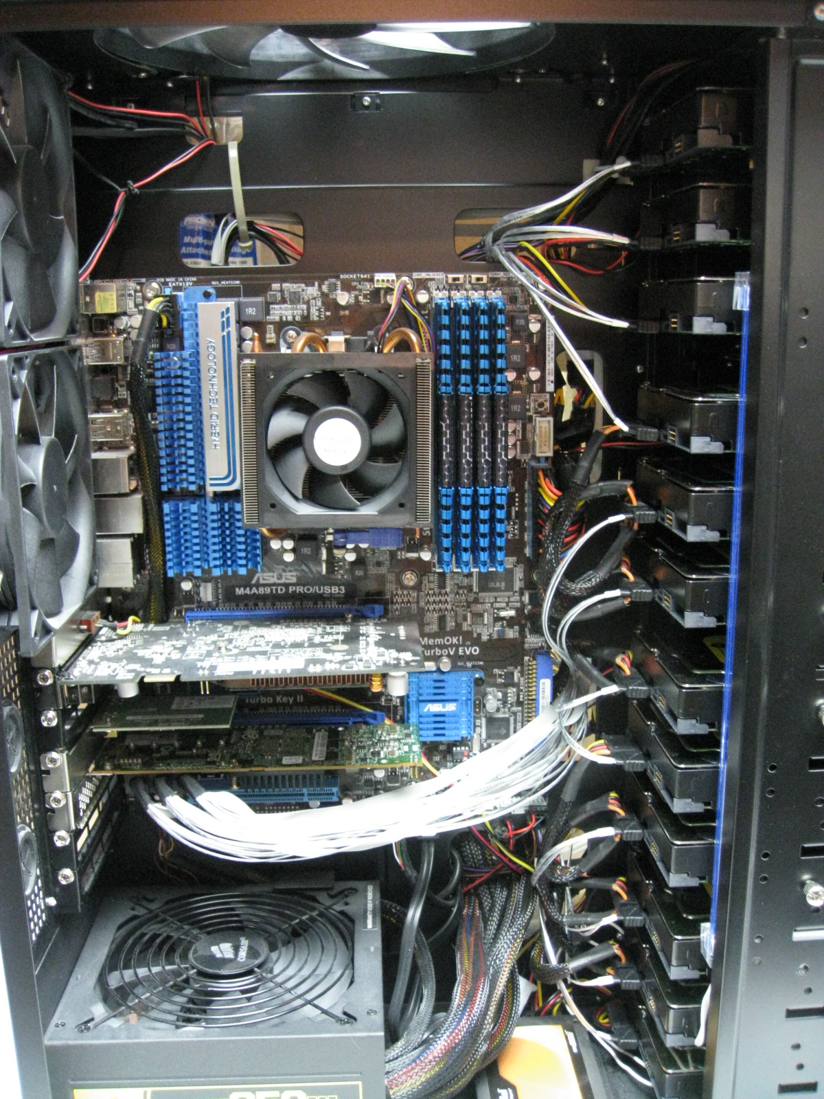 SuperServer is the nickname for my 40 TB personal data storage server, currently running in RAID 6 with an Adaptec 71605 RAID card on kubuntu 10.14. This baby can pretty much download the internet!