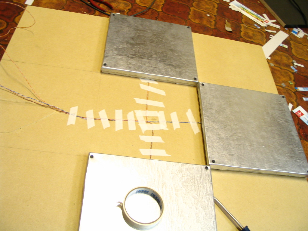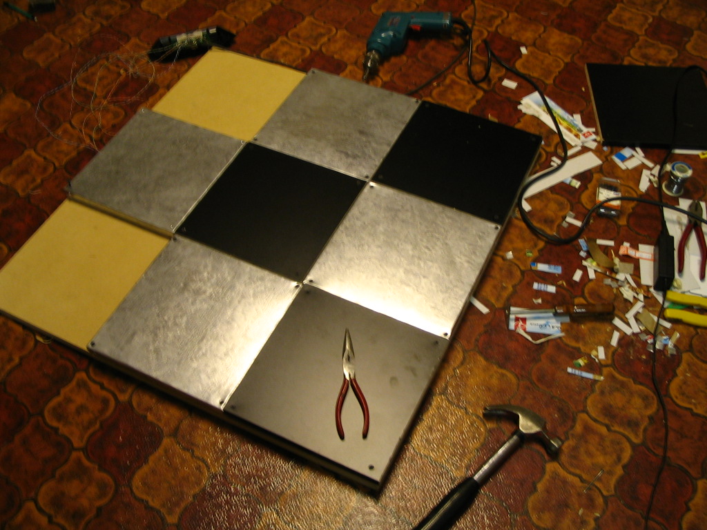 Took us about a full afternoon to build from start to finish, and we had a blast doing so. The buttons are made using tinfoil, sheet metal and a chunk of wood. The tinfoil is glued onto the board, with the corners elevated using strips of cardboard / masking tape. When pressure is applied to the sheet metal, which is placed on top of the board they make contact and create a connection. One wire is attached to the tinfoil, and the other to the sheet metal. The wires then directly attach to the control board for the old DDR mat. Turned out fairly well too, except one button was a little sticky but it was workable.