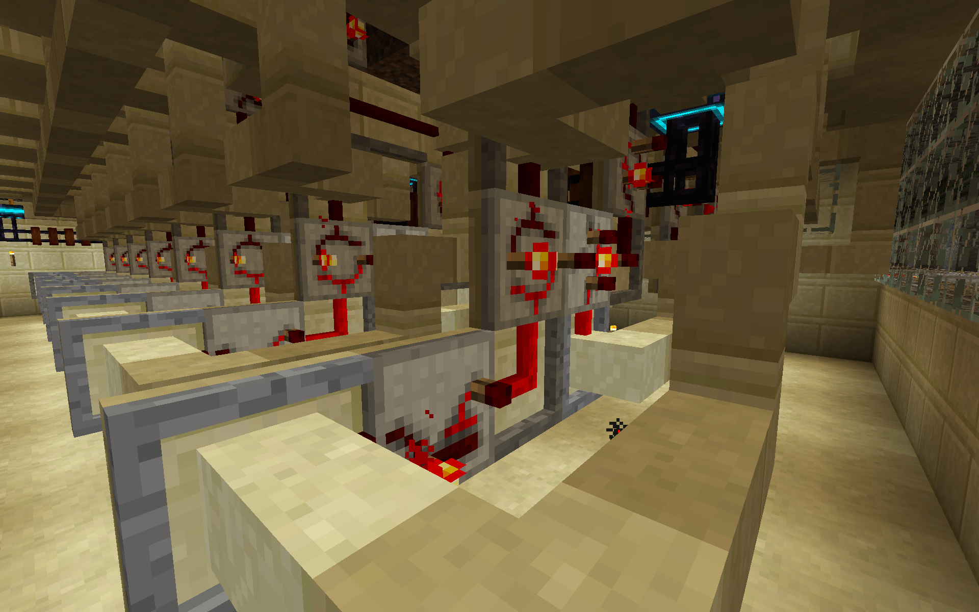 A glimpse at some of the wiring for our minecart destination selector. Uses a fairly simple system of RS Latches w/ delays to keep track of state & allow for easy resets.