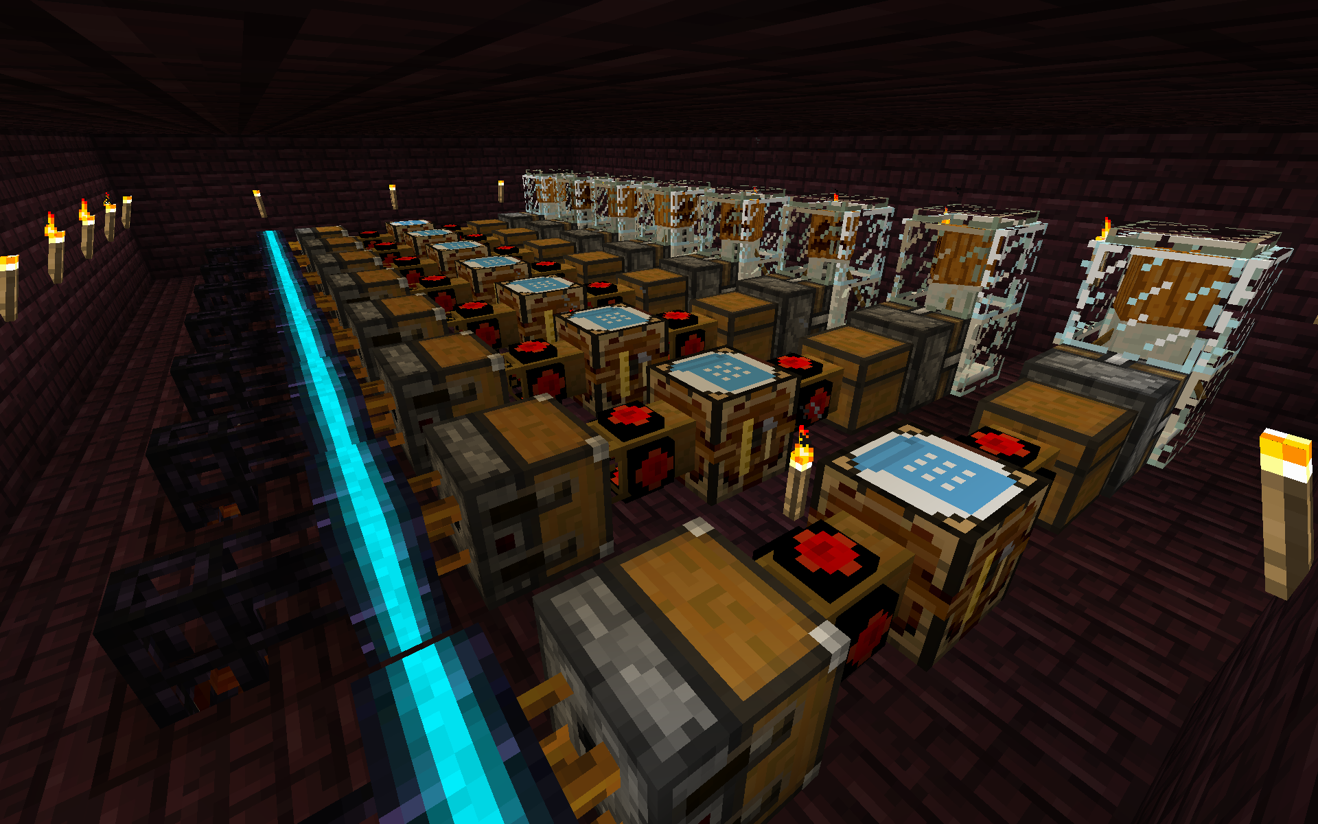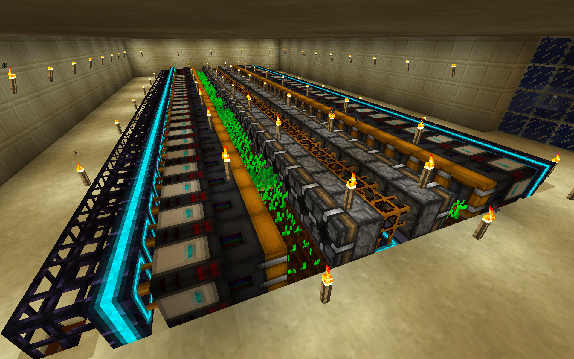 An overhead view of the main floor of the fully automated Flax plant farm. Uses block update detectors to detect plant maturity. Once a plant is fully grown, it will be auto harvested and replanted. The drops are automatically sorted too!