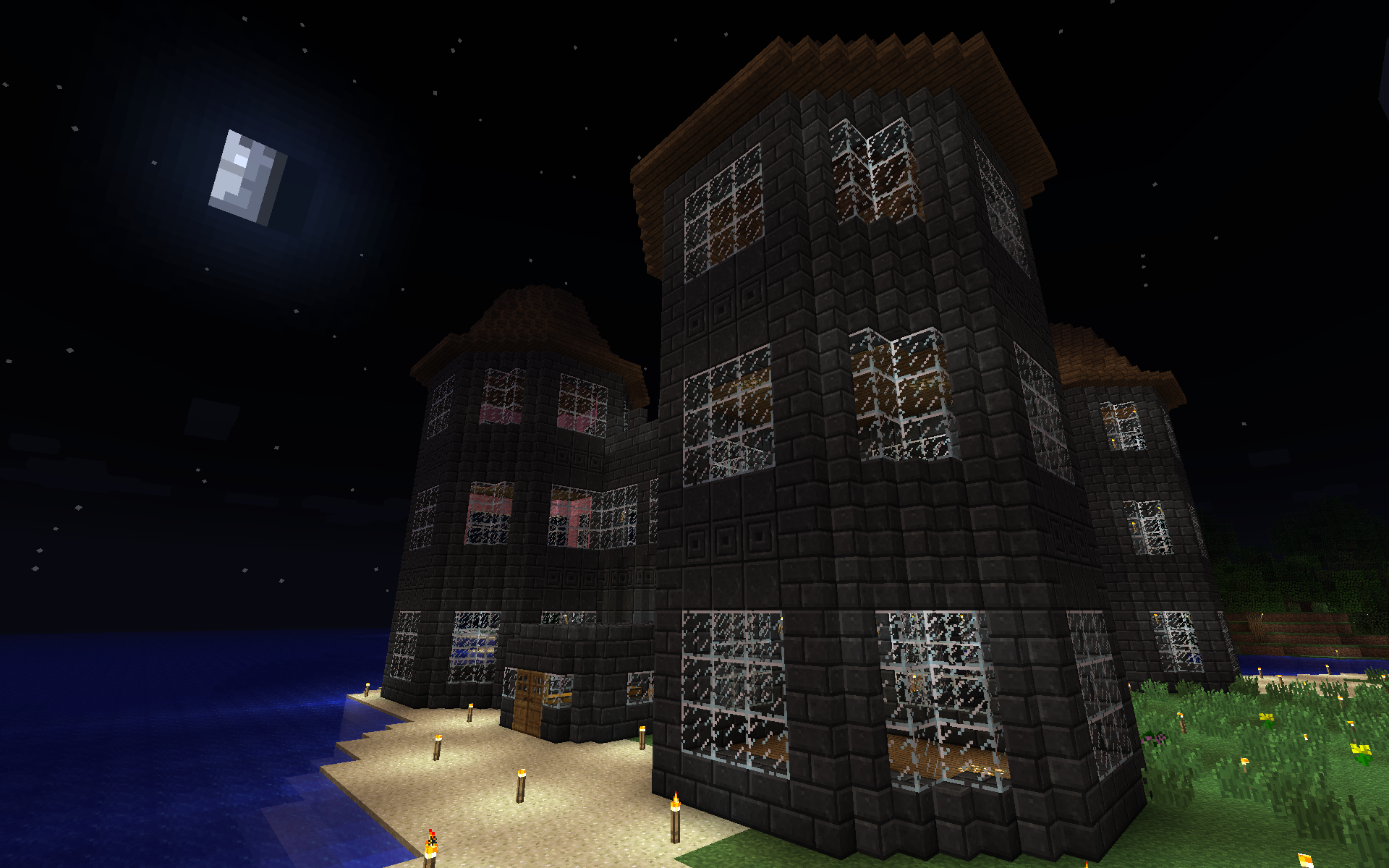 The castle on our server, built out of basalt microblocks from RedPower2! Has lots of rooms and a massive underground area.
