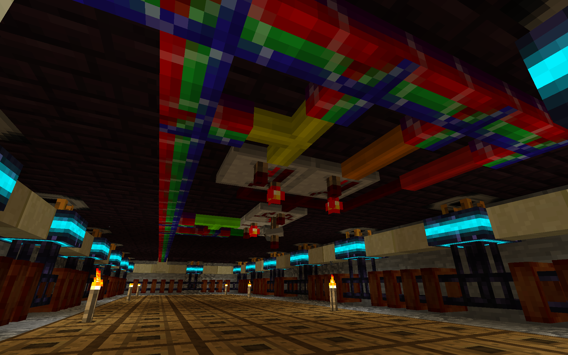 Quite a mouthfull, isn't it? It links components from RedPower2 and BuildCraft together, which can be a little awkward. There's a total of 8 identical modular refining systems where there are 4 placed on each side of the room. The system can be controlled using energy generated from BuildCraft combustion engines or RedPower2 bluelectric engines (although combustion is much faster and bluelectric usually drains the whole battery room). There are buttons on each side of the room to turn on / off individual refining systems, or to turn them all on / off at the same time. Combustion engines are hooked up to RedPower2 circuits that automatically monitor the engine to ensure that the coolant pumps are operating at optimal efficiency to avoid overheats, that there is oil to be processed and that the engine has not overheated. Oil is automatically pulled from the farthest row of tanks with oil in them and placed in the closest row of fuel tanks that still have room. All of the wiring is hidden on both the floor and cieling immediately below the main floor, with cables and wires twisted and tangled in every direction. It was quite a headache to keep track of which bundled cable I was dealing with as they all have the same coating (a mistake on my part), but I had a text file full of notes on how the system worked. Even then, I even had a hard time figuring it out while I was working on it!