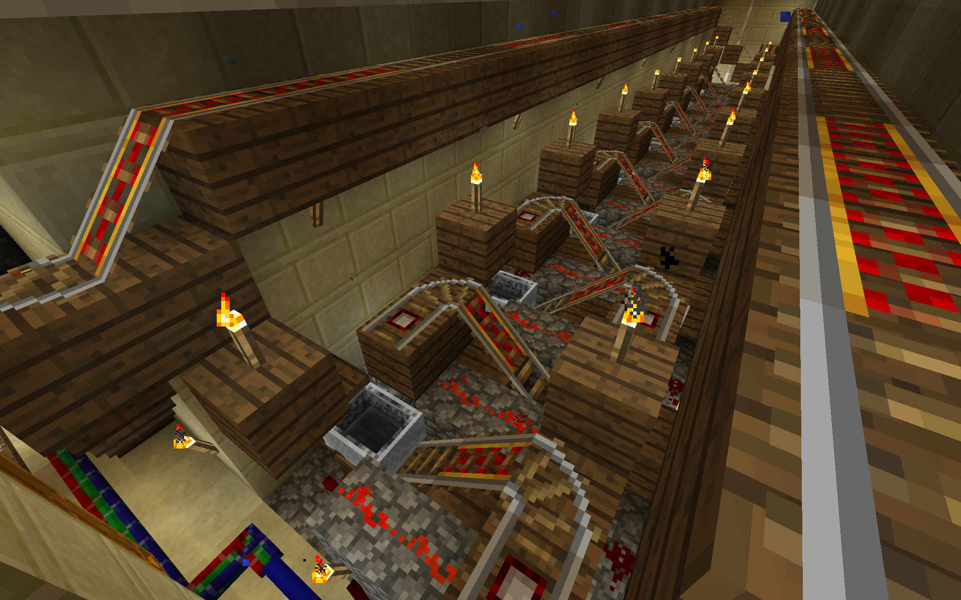 The minecart dispenser / storage system, hooked into our minecart station for automatic and simple storage / retrieval of minecarts!