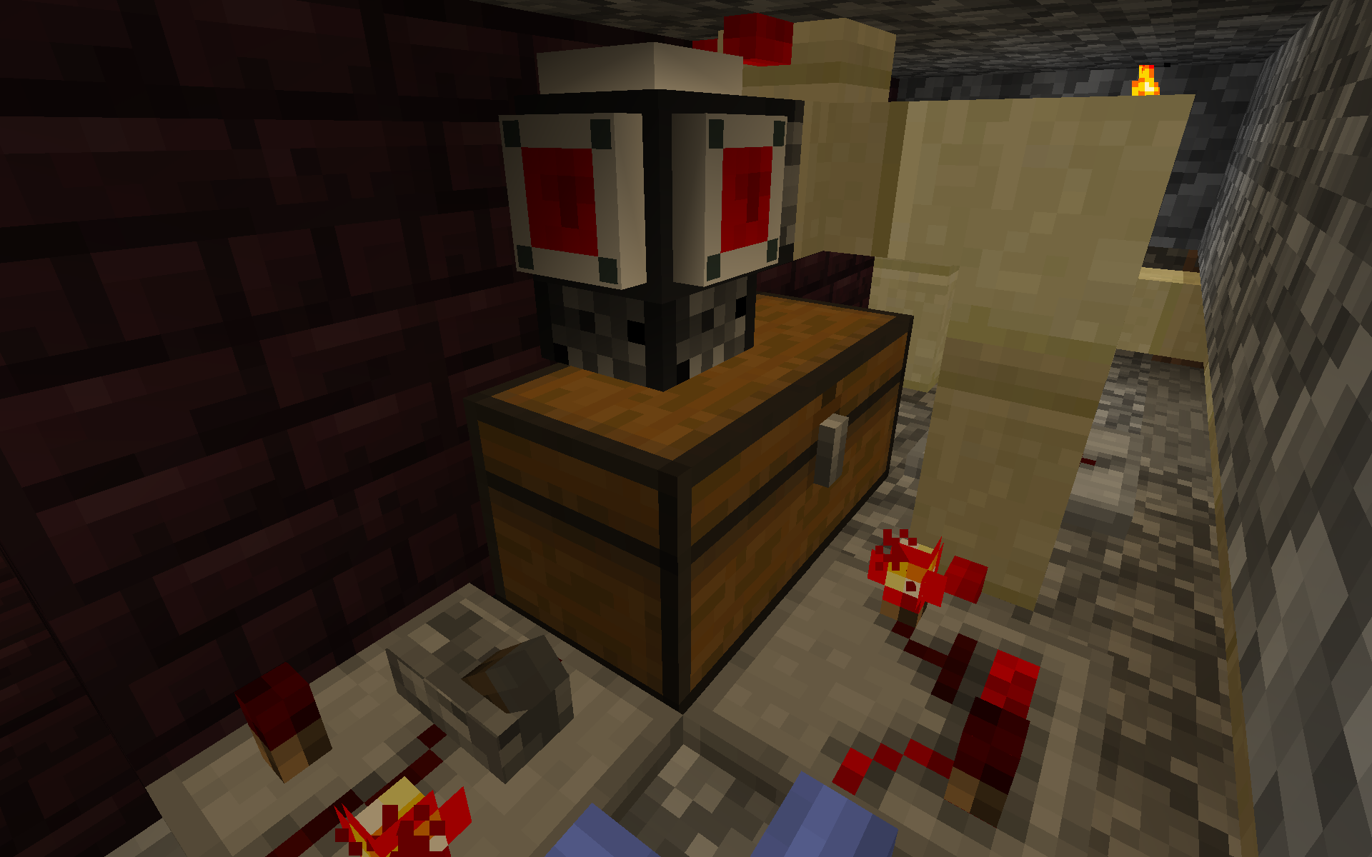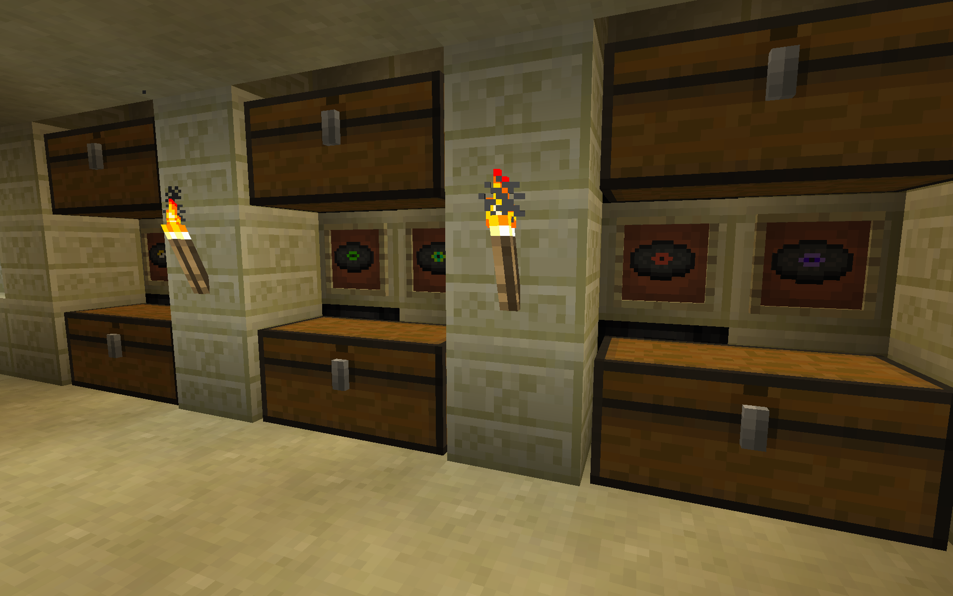 Another really cool area we have is our record farm! In case you don't know, you can get records in Minecraft by getting a skeleton to shoot and kill a creeper. So my friend and I had previously designed a record farm in our other server where one person would bait creepers into a pit of water, so as to have them flow into a single holding area, where they await their death. A single skeleton would also be required in the holding area opposite the creepers, so it can line up a shot with them and have clear visibility to the player. There is also an option to dispose of unwanted mobs, like zombies.