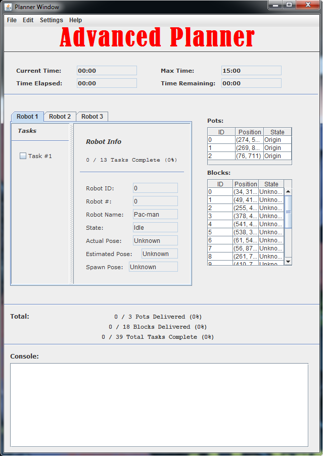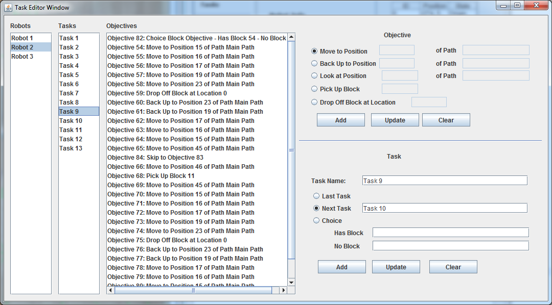 We decided to take a high level approach and take advantage of the position tracking system which gave us the position of each robot as calculated using an overhead webcam which monitored the robots through the use of algorithms to identify the position, direction and id of the tracking tag above each robot. Our software system also used a separate communication system to allow the computers to directly communicate with each other. This allowed each user to view real time updates and progress on the program's interface as well as down on the ground. We had a set of dynamically programmable tasks and objectives that were pre-defined for each individual robot. Each task is defined in such a way that it would instruct the robots to move in such a way that they would never come into collision with one another, so basic sensor-based collision avoidance was not required for this project.